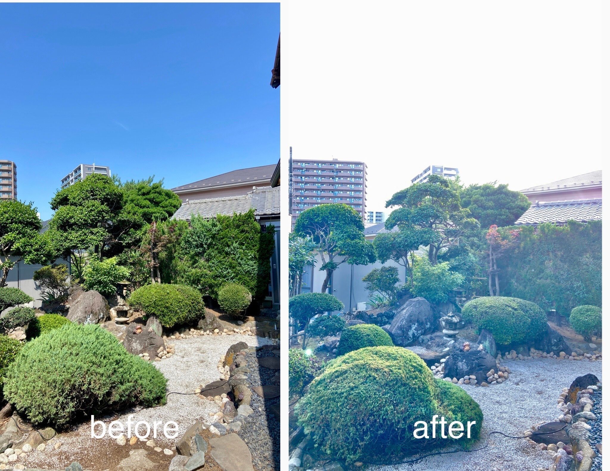 画像のように、雑然としていた庭木も美しい曲線を取り戻し、石や砂利との調和が際立つ和の空間へ。