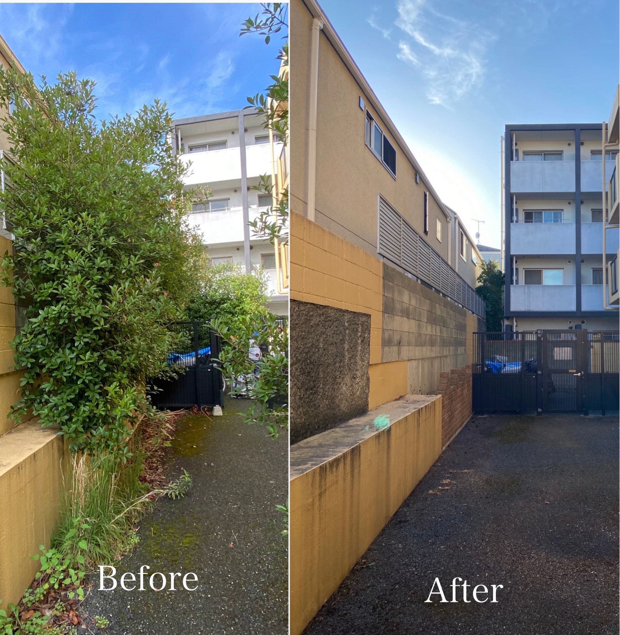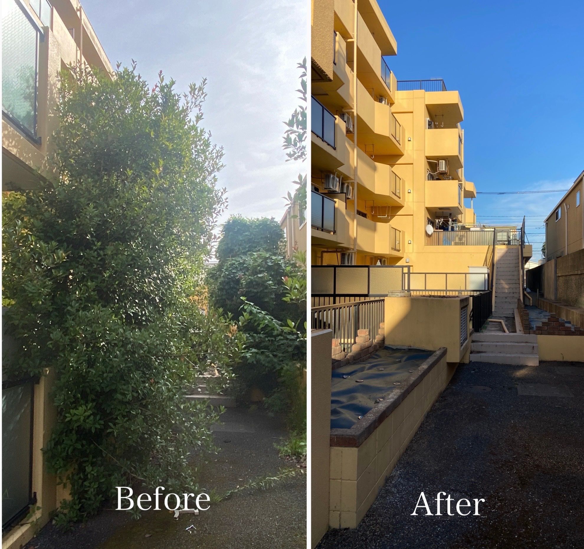 生い茂った植栽をスッキリ剪定!明るく安全な通路に大変身✨
