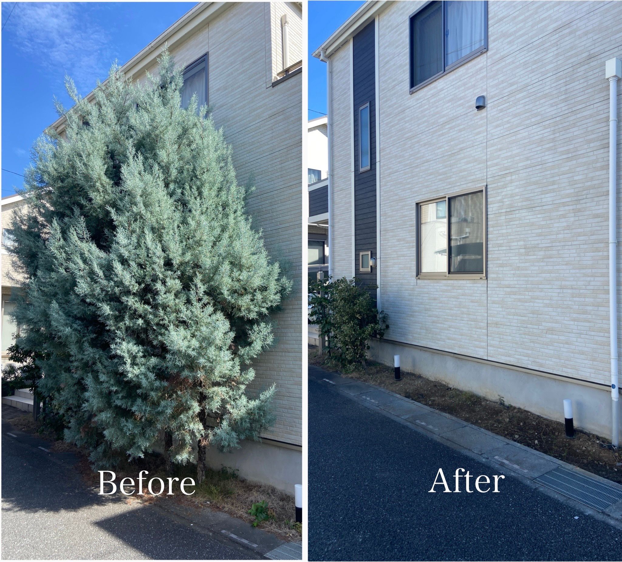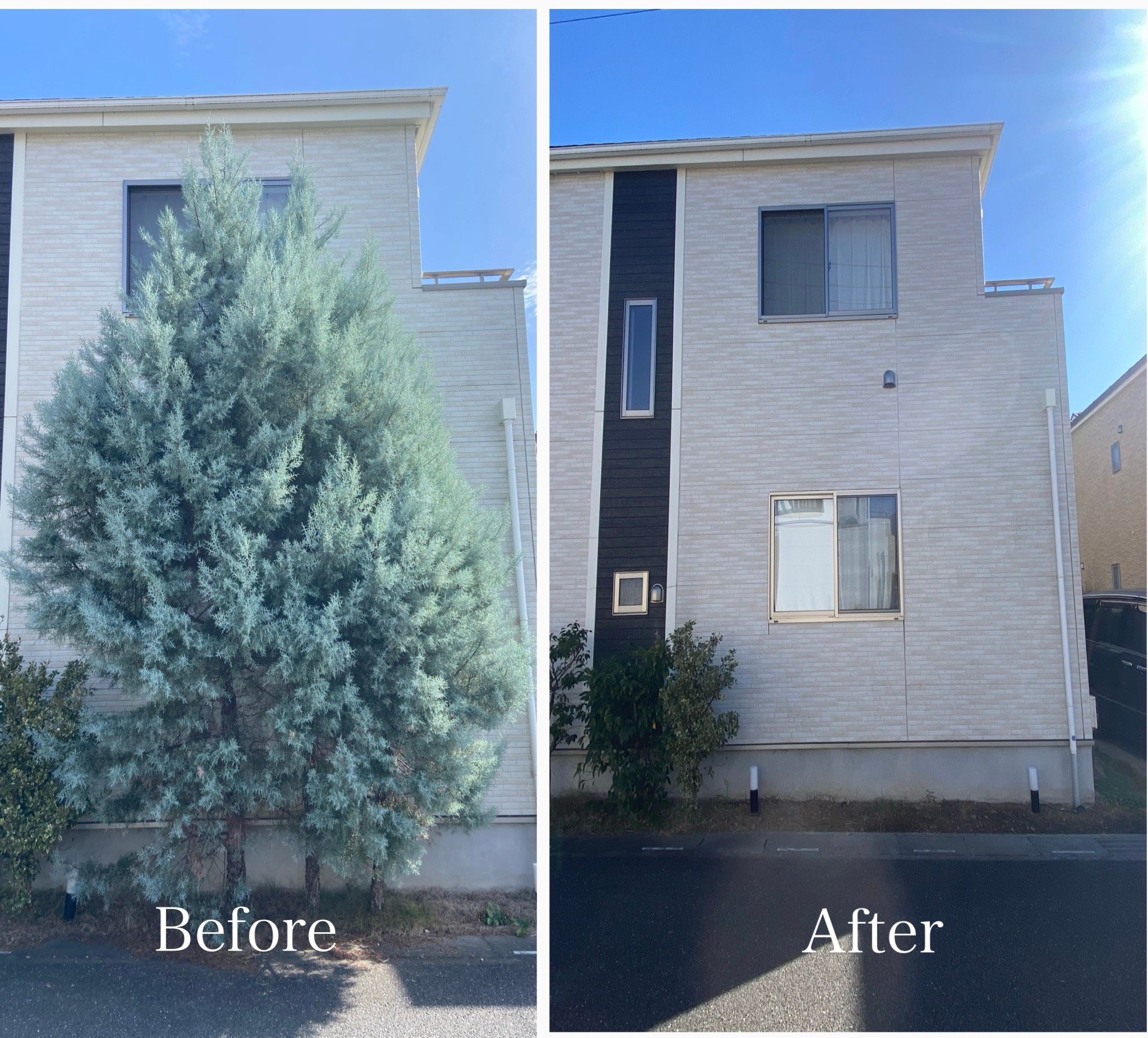 家の前がこんなにスッキリ!大型樹木の伐採で明るい外観に生まれ変わりました