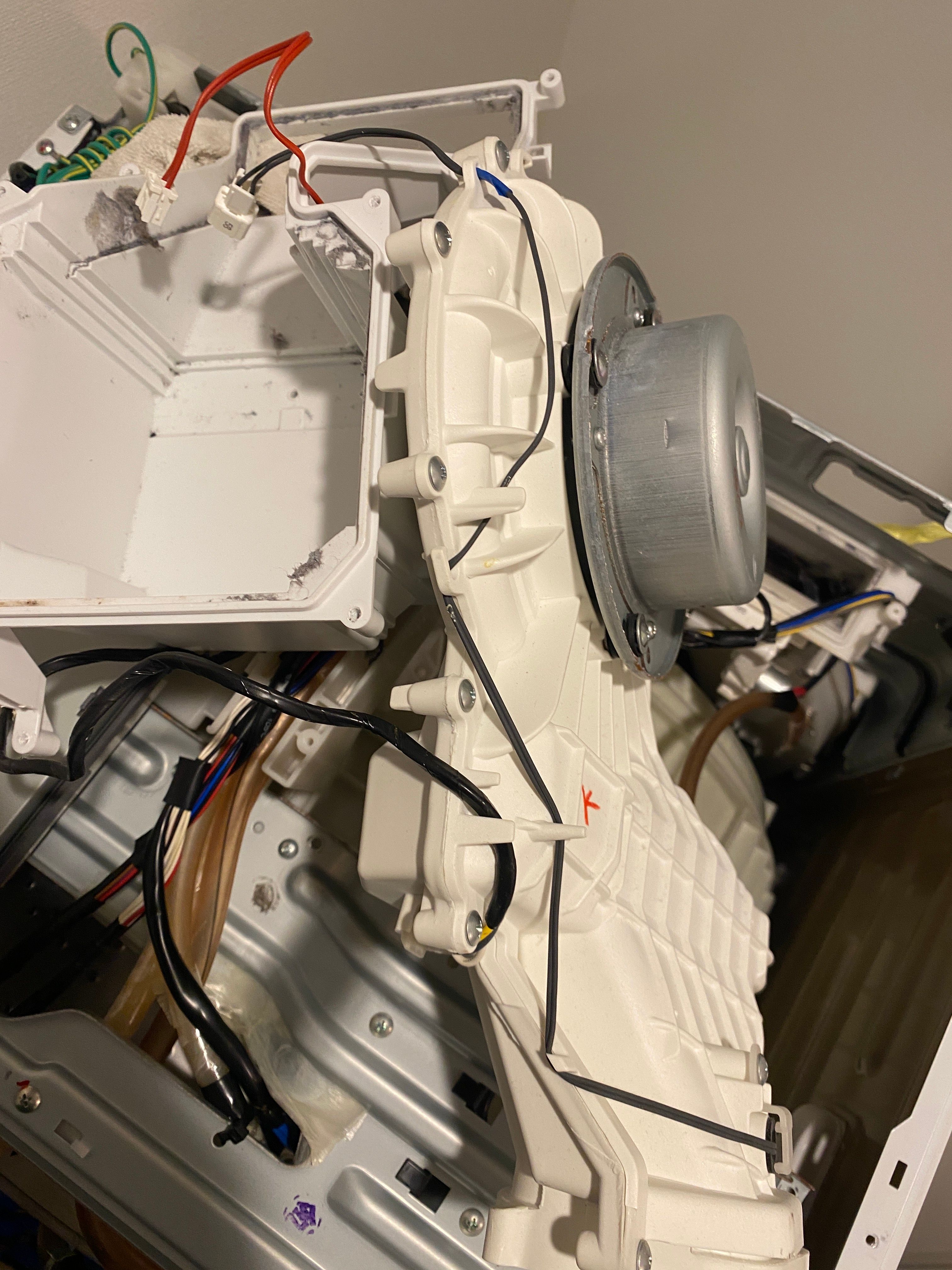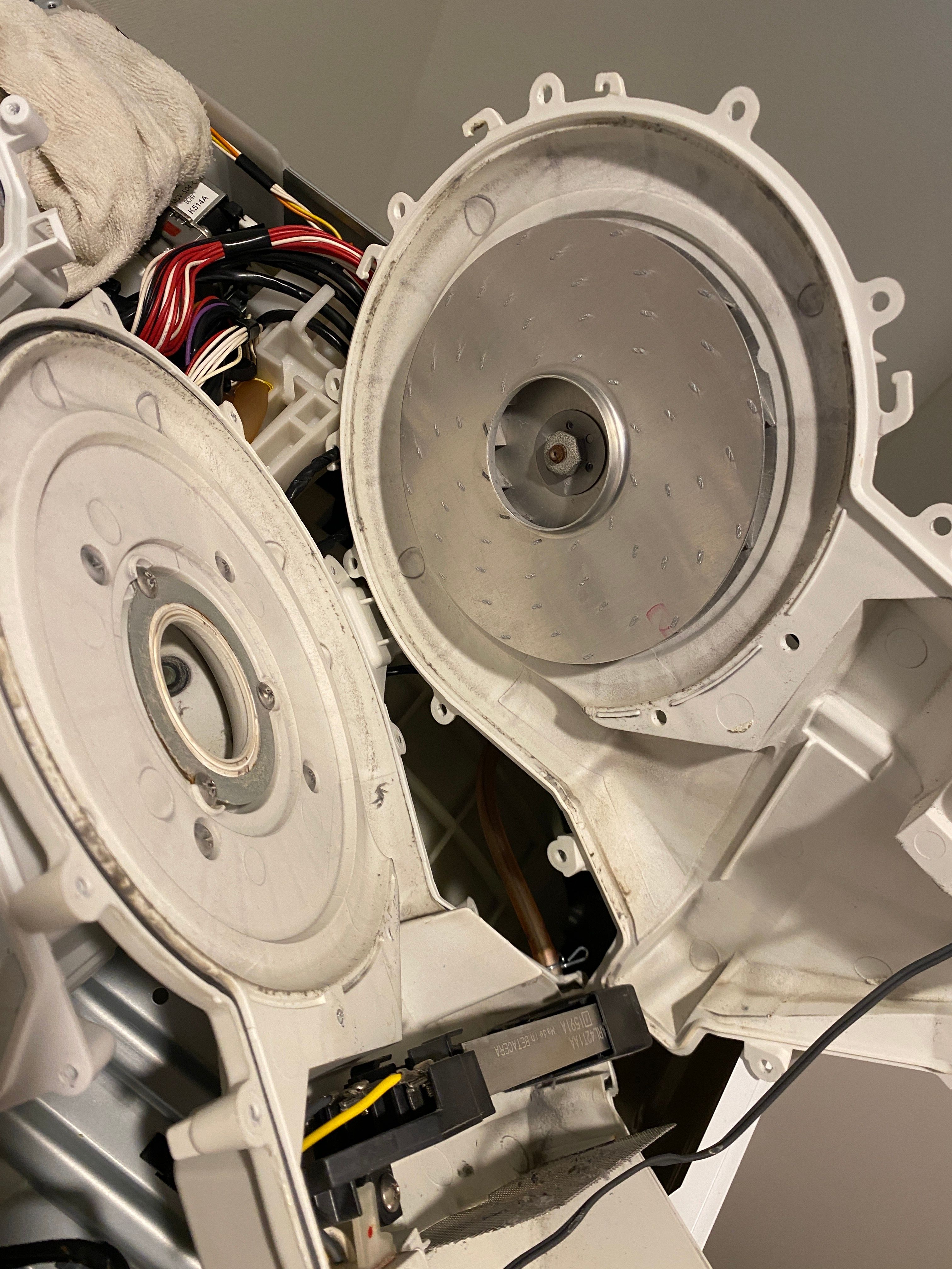 分解チェックへ。後ろのパネルを外し、乾燥ユニットにアクセスすると、乾燥ファンの軸がガタガタ。