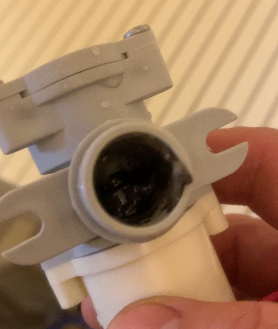 長年使っている間に、カビや糸くず、洗剤カスなどが固まって排水ができなくなっていたようです。