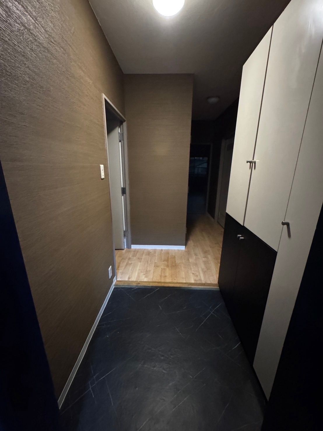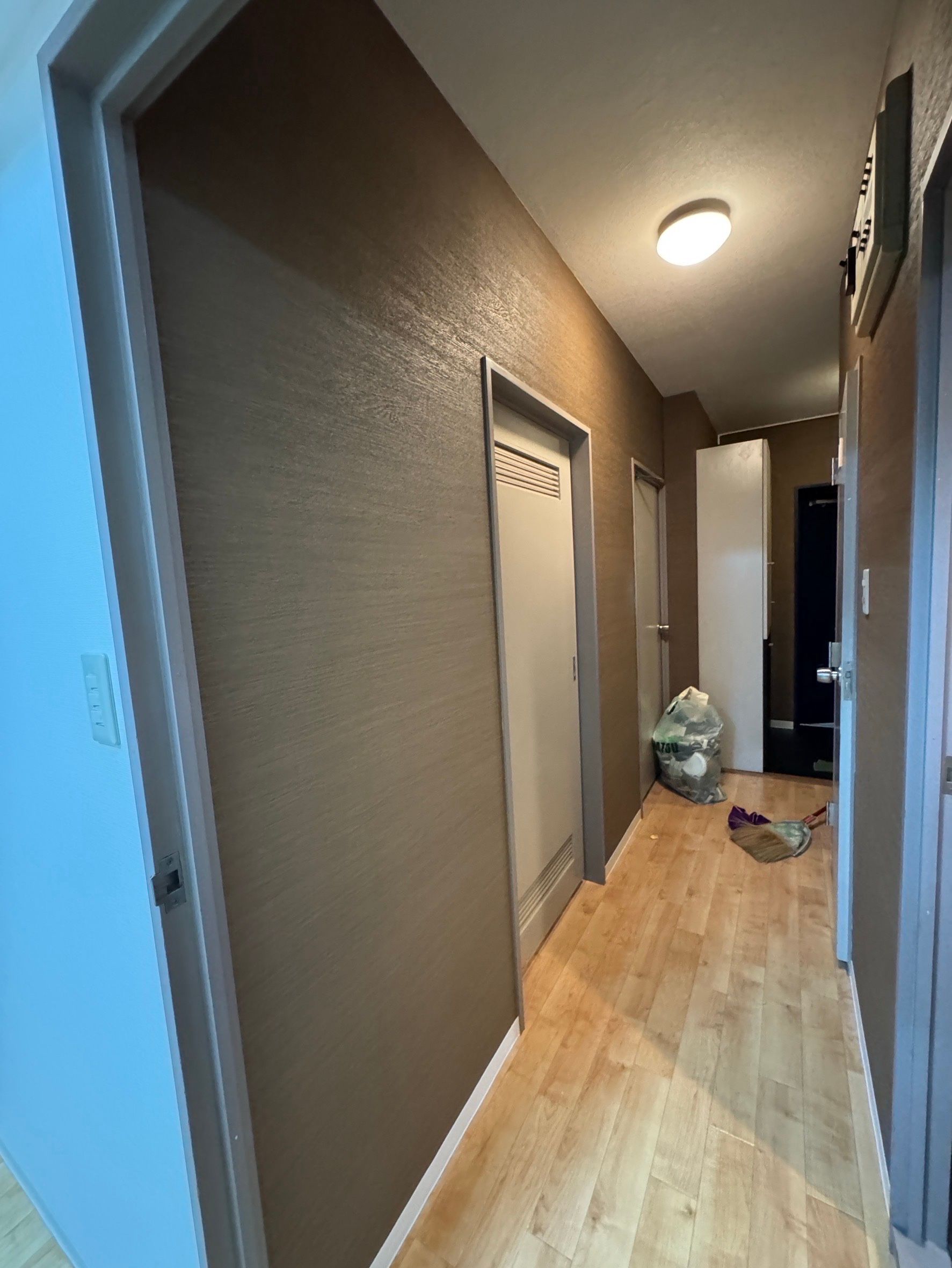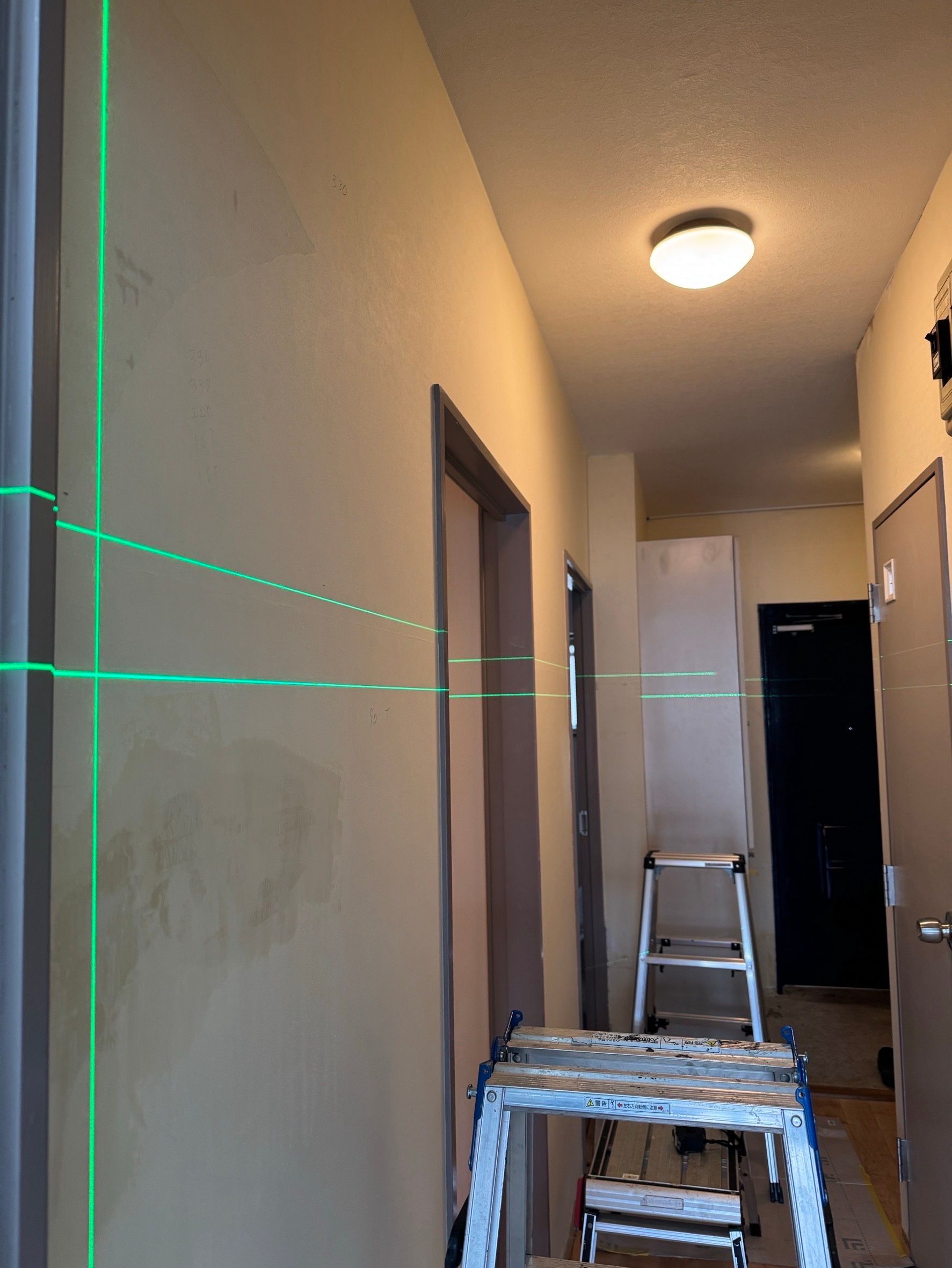 こんにちは!前日のクロス工事の現場です。現状回復工事廊下の張り替えの様子です。トキワのクロスで、木目調横張り指定での対応です。下地はかなり良かったので、安心しました(^^)レーザーで墨出しして、しっかりと水平で仕上げられるように施工しました。ご利用ありがとうございました。