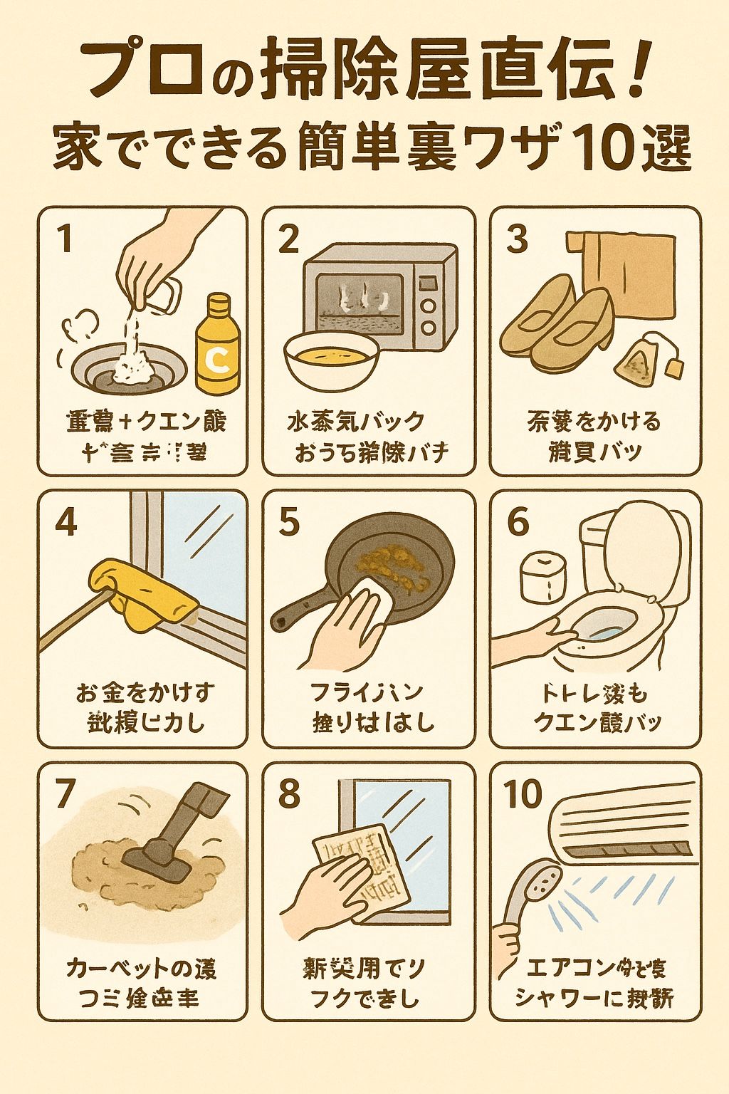 掃除って毎日のことだから、できるだけラクに、効率よく終わらせたいですよね。実は、プロの掃除屋が現場で培った技術の中には、家庭でも簡単に取り入れられる裏ワザがたくさんあります。今回は、家にあるものでできる簡単掃除術10選をご紹介します!
