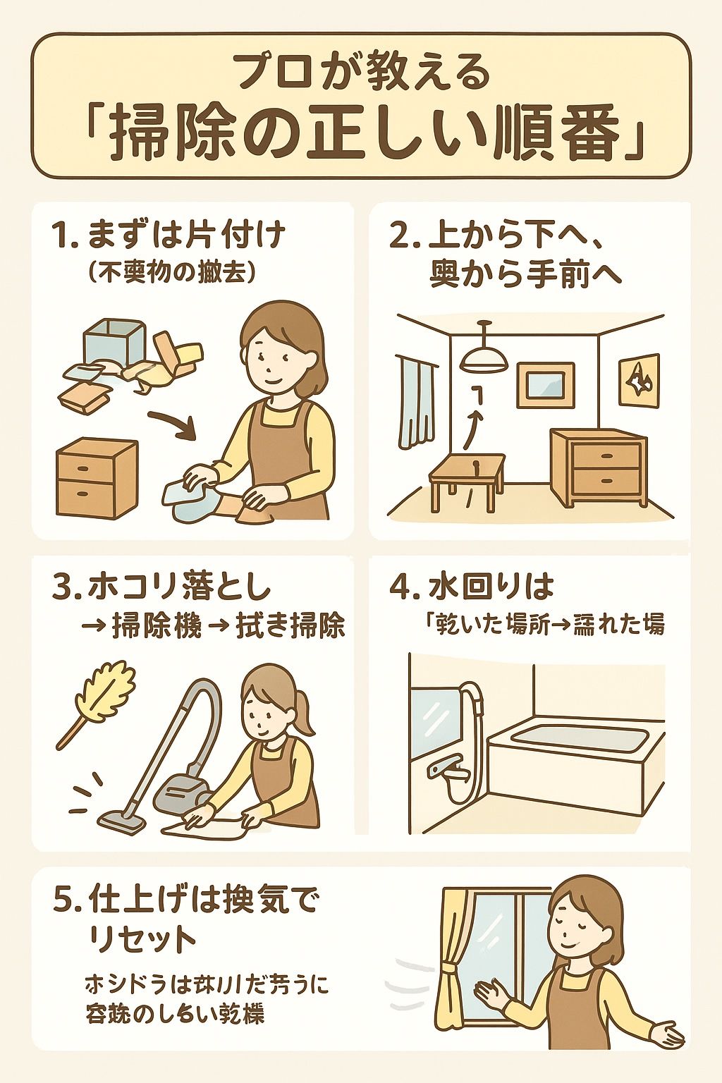 実は掃除には“正しい順番”があるんです。順番を守ることで、短い時間でも効率よく、しかも仕上がりがグッと良くなります。今回はプロが実践している掃除の流れを解説します。
