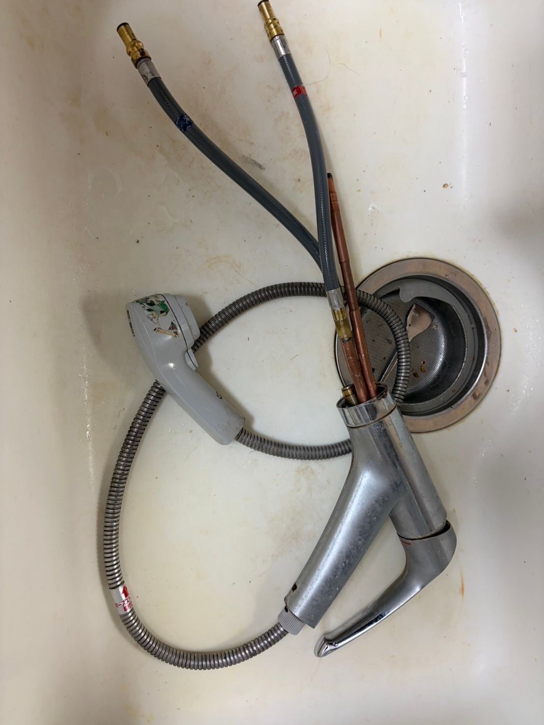 既設の水栓では シャワーホースが切れてしまい、キッチン下の収納へ水が漏れてしまう状態 に…。