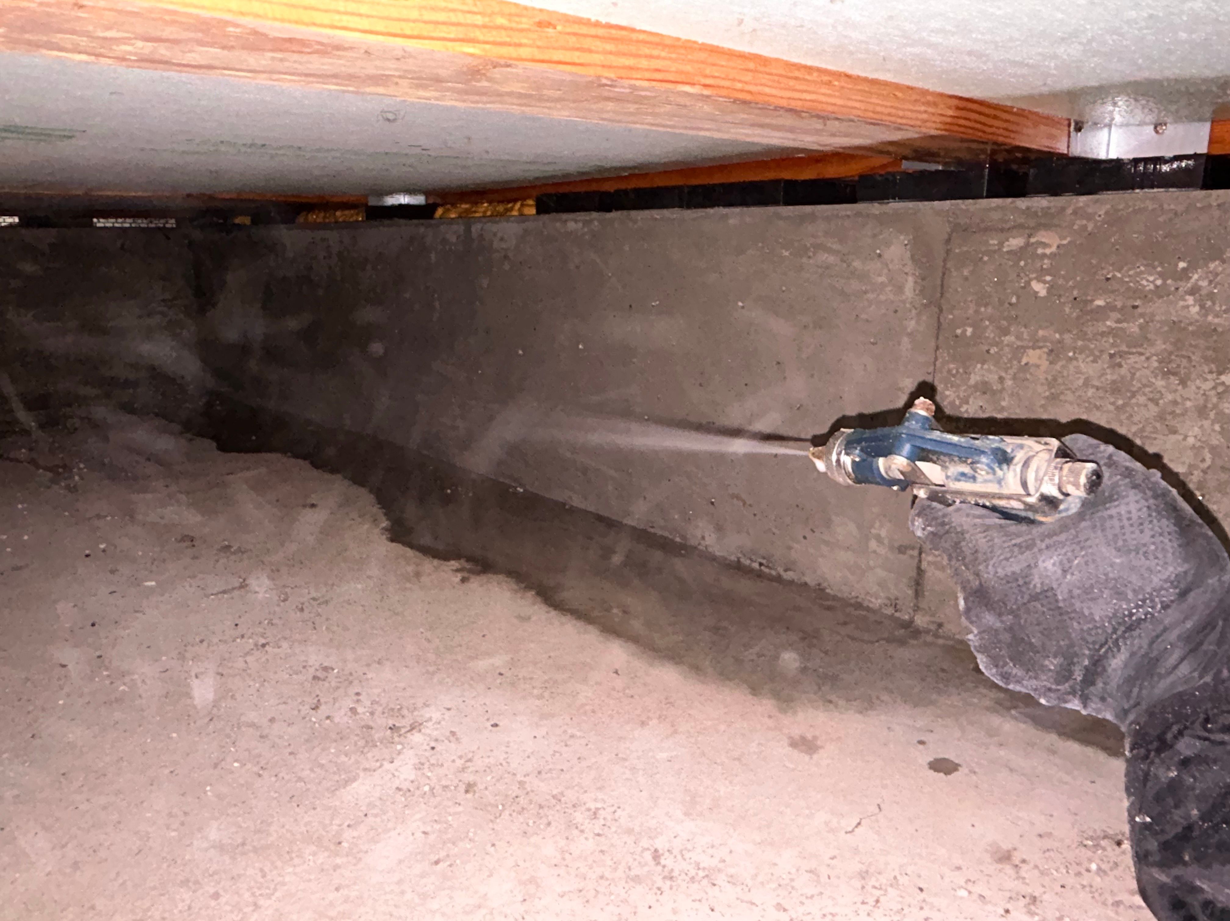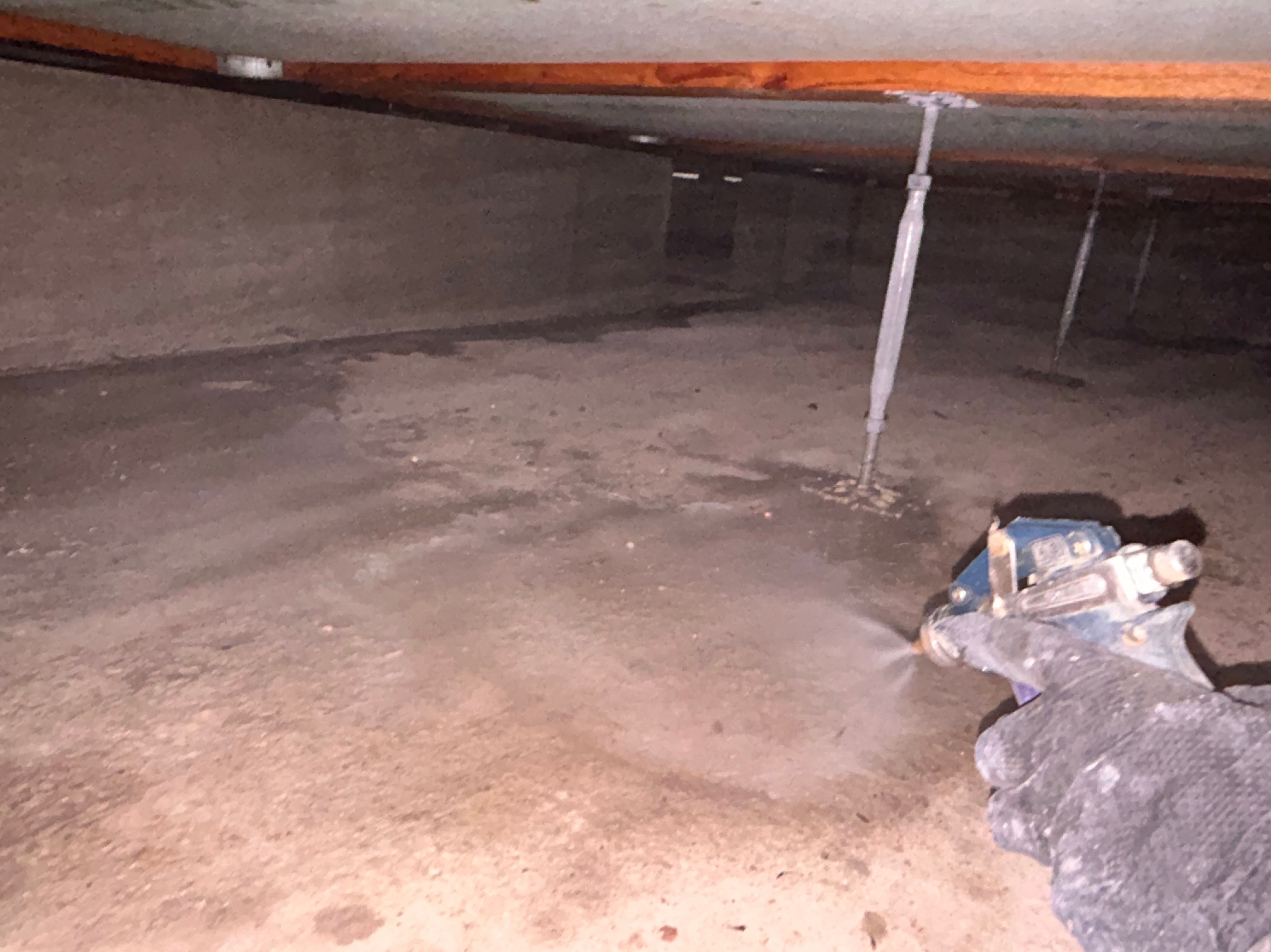床下の基礎コンクリート面や木部に向けて、薬剤をしっかり噴霧散布しました(写真1~3枚目)。