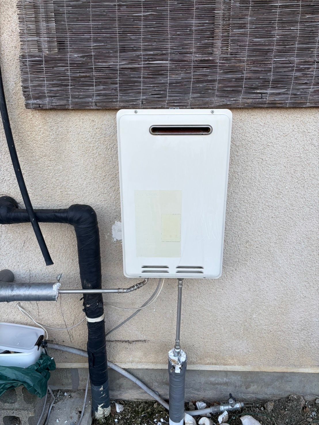 既存の給湯器は屋外壁掛け型で、配管の保温材も経年で傷みが見られました。