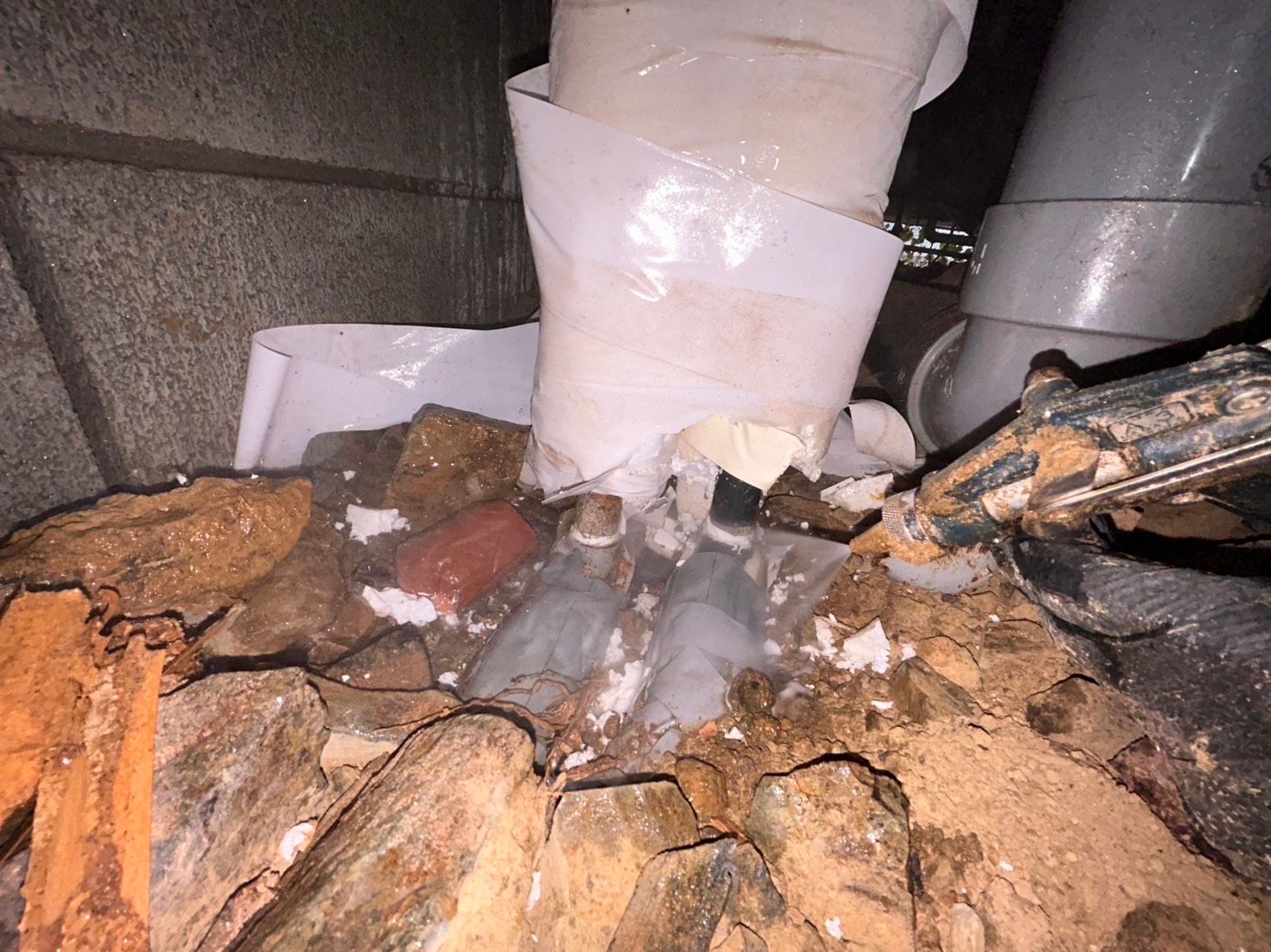 床下の点検を行うと、配管周りの断熱材にシロアリの通り道(蟻道)が形成されており、