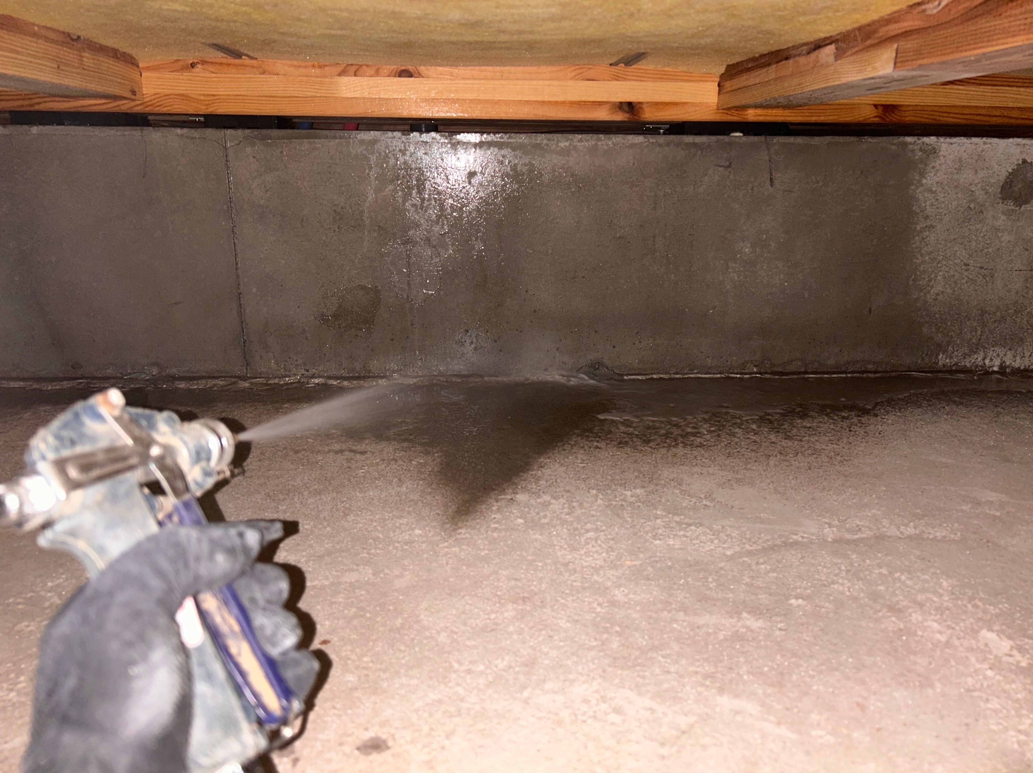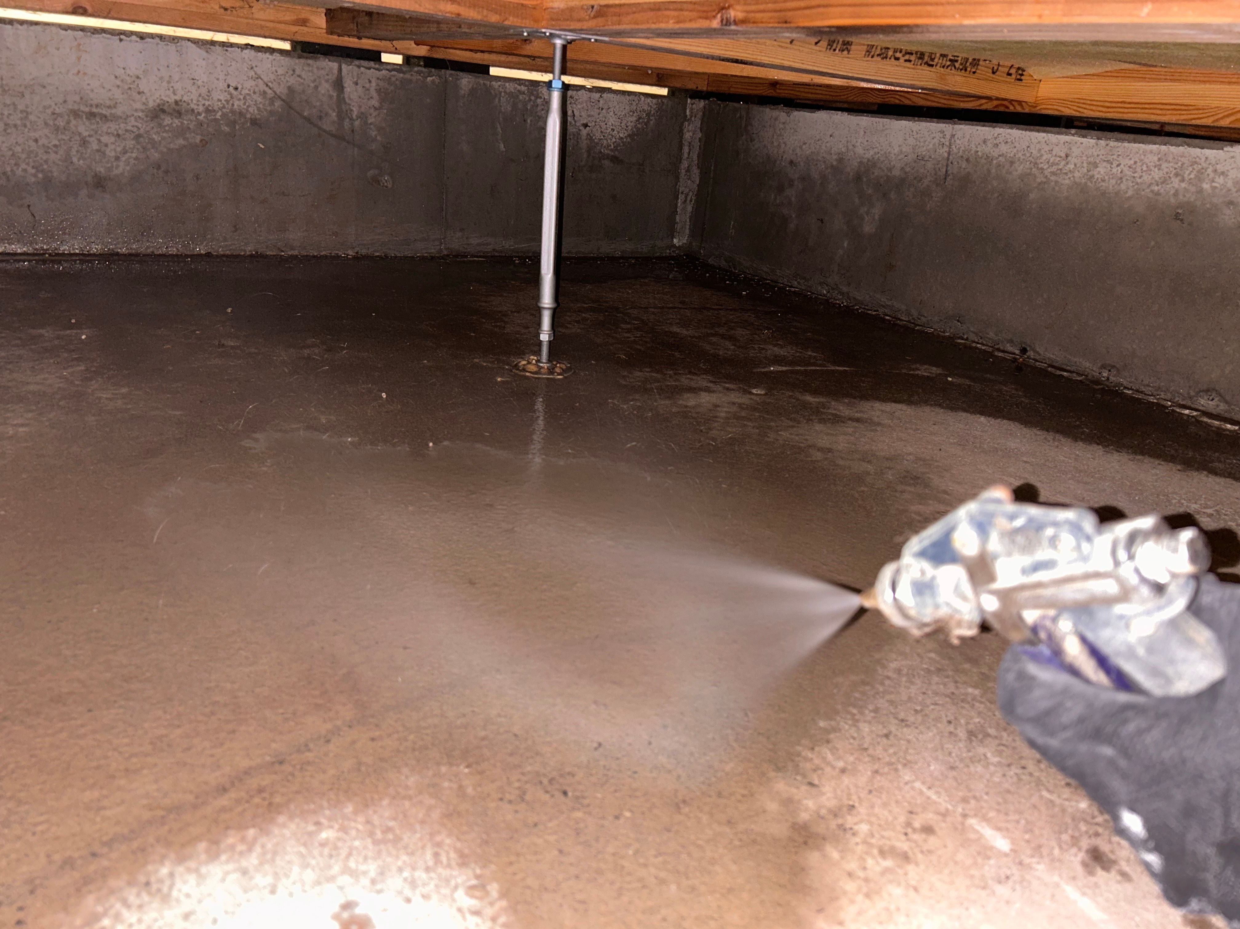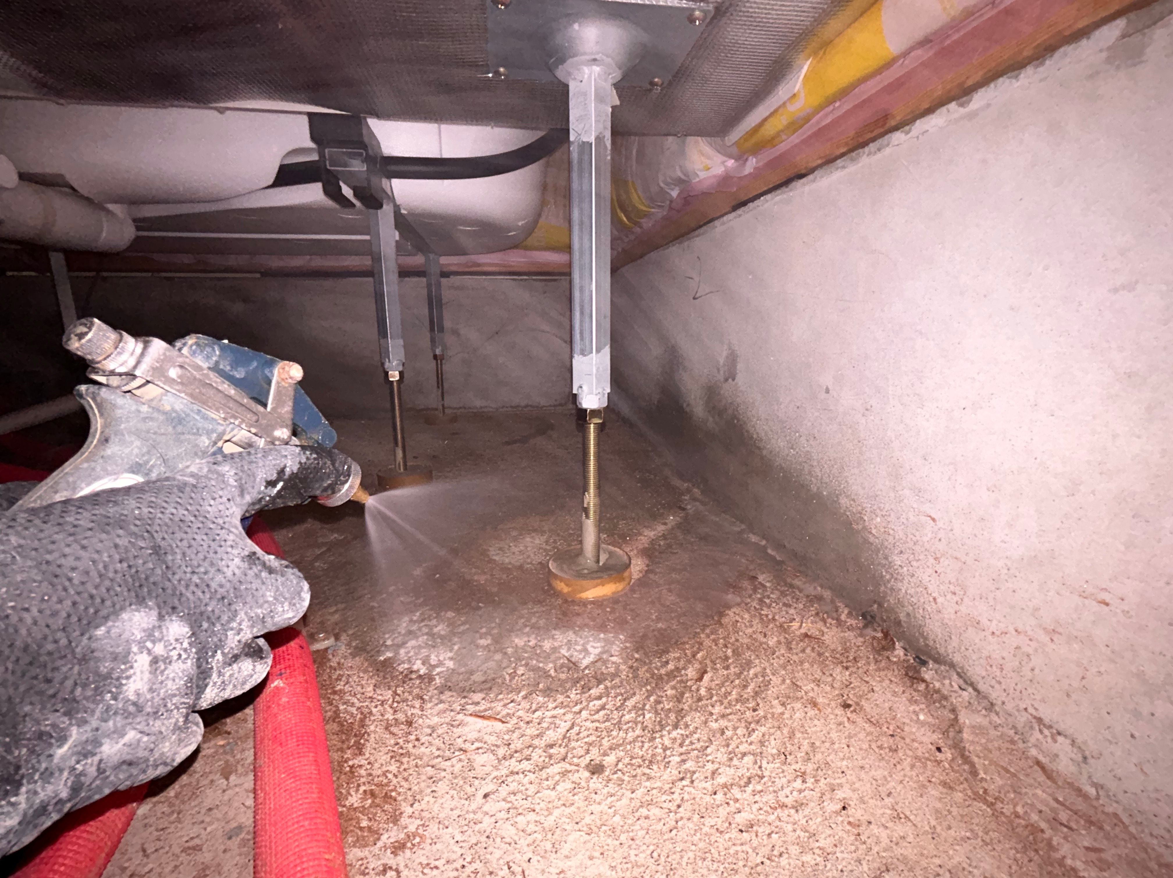 外回りの点検中にシロアリの活動が確認され、建物内部への侵入を未然に防ぐため、床下全体に薬剤を散布しました。
