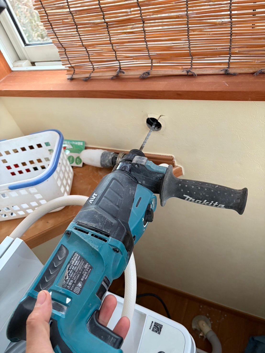 室内の洗濯機水栓位置に合わせて、屋外側からも確認しながら壁に貫通穴をあけて新ルートを作成。