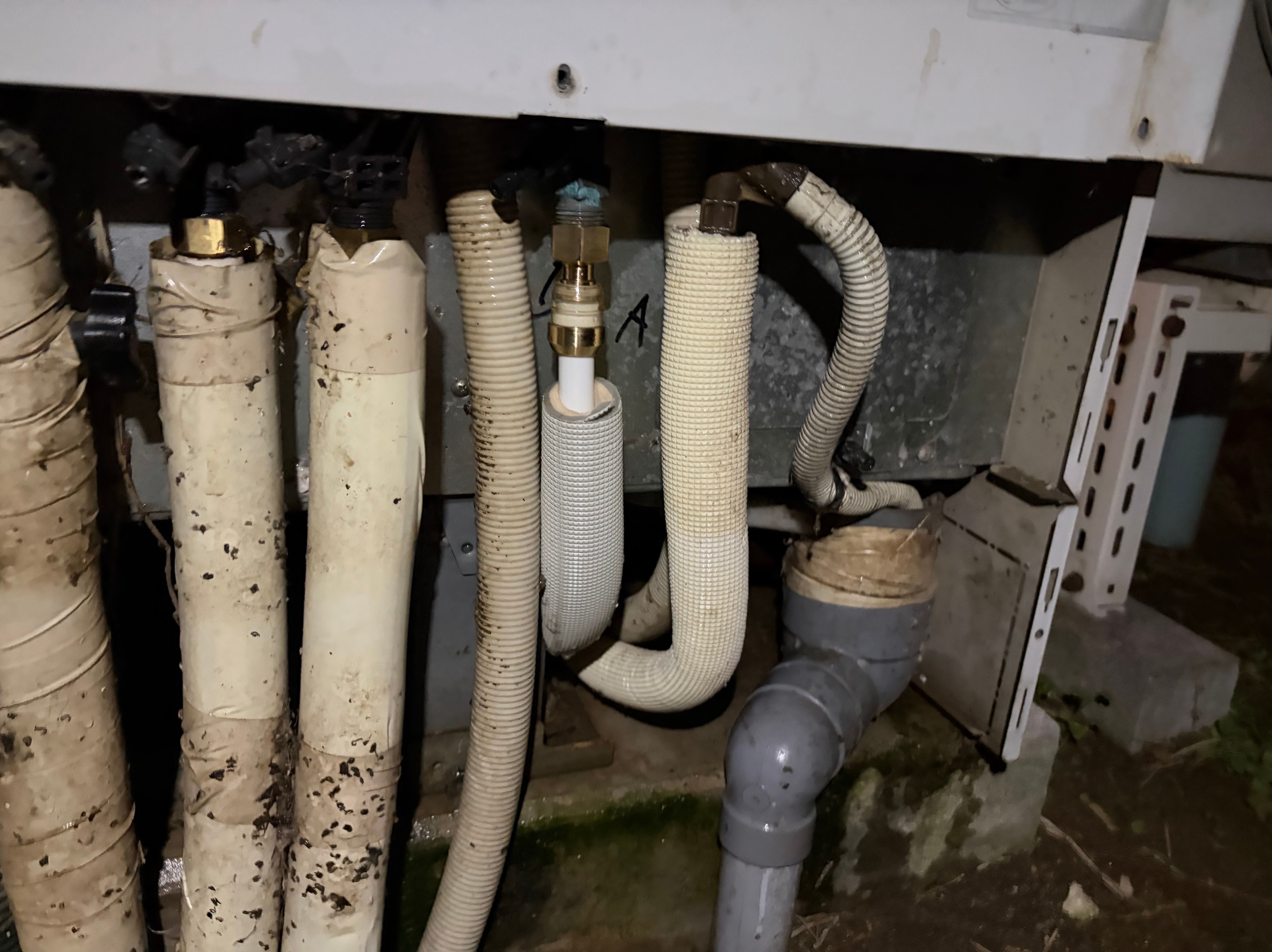 点検したところ、三層管(配管)の劣化による水漏れが確認できました。