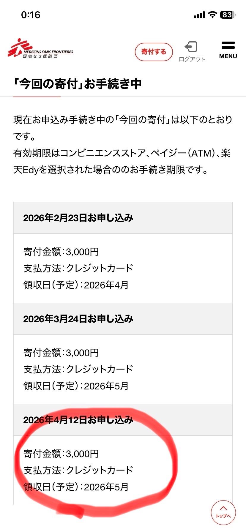 今回も「国境なき医師団」に寄付させていただきました。