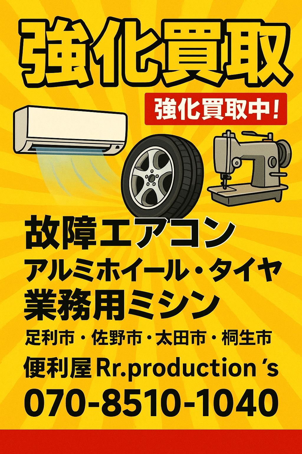 💰 便利屋 Rr.production’s|強化買取キャンペーン実施中! 💰 ただいま下記のお品物を 特別価格で強化買取 いたします。 🔧 対象アイテム • 故障して使えなくなったエアコン • アルミホイール・タイヤ(セットでも単品でもOK) • 業務用ミシン ✅ 動かないエアコンでも大丈夫! ✅ タイヤは溝が少なくてもご相談ください! ✅ 古い業務用ミシンも買取可能! 📍 対応エリア:足利市・佐野市・太田市・桐生市周辺