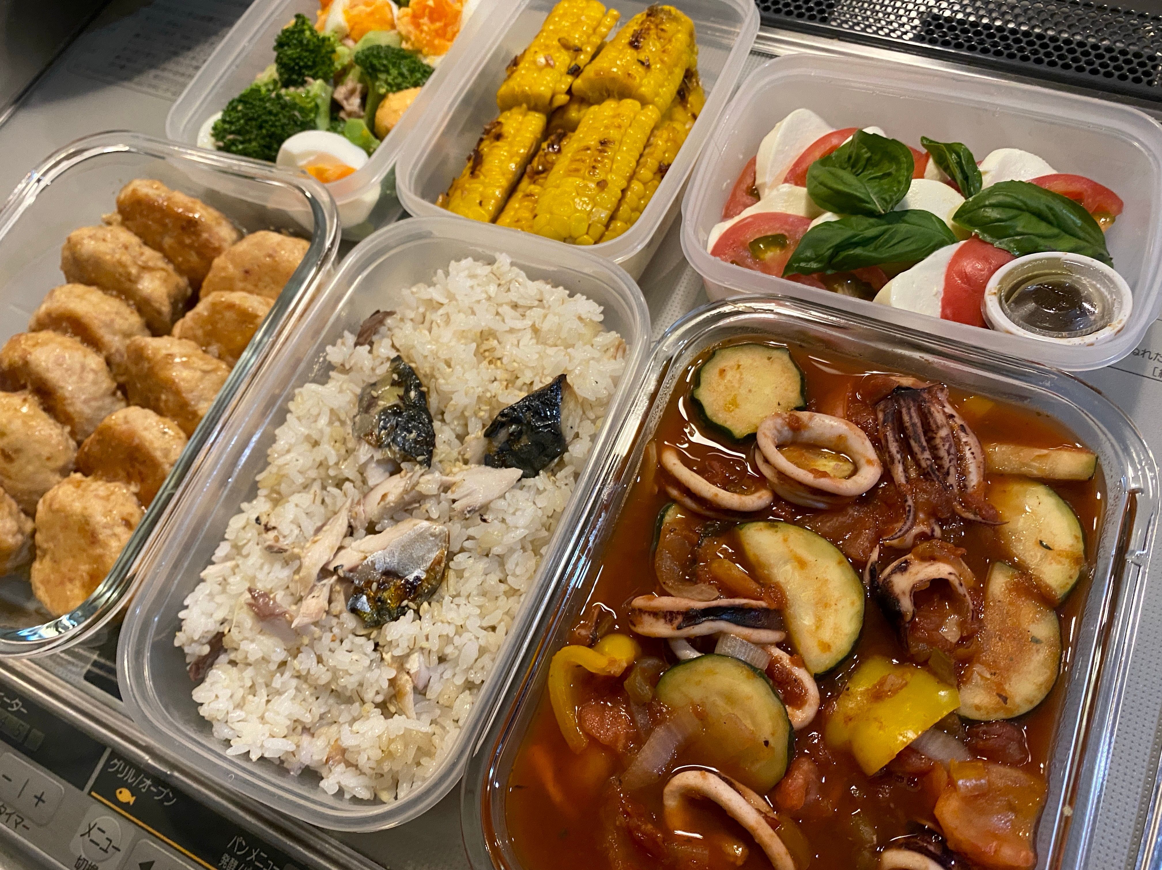 2時間半7品例です。イカと夏野菜のトマト煮焼きサバと生姜のごはん鳥ひき肉と豆腐のハンバーグカプレーゼにんにくバター醤油の焼きとうもろこしブロッコリーと卵とツナのサラダキウイとココナッツのアイスクリーム