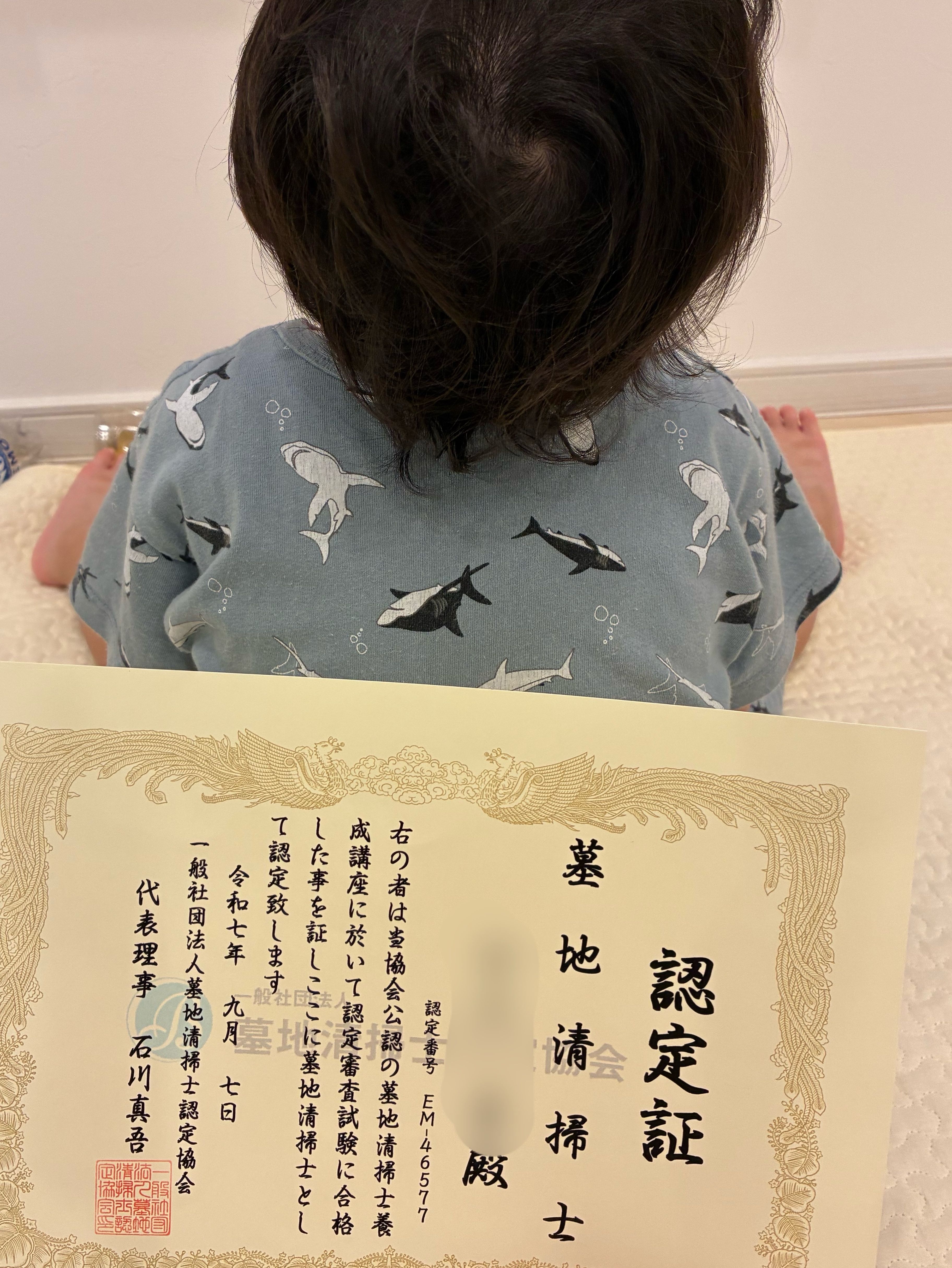 はじめまして!お墓参り・掃除代行 ウイングの店長です。取得している【墓地清掃士】の認定証と長男クンの写真です♪