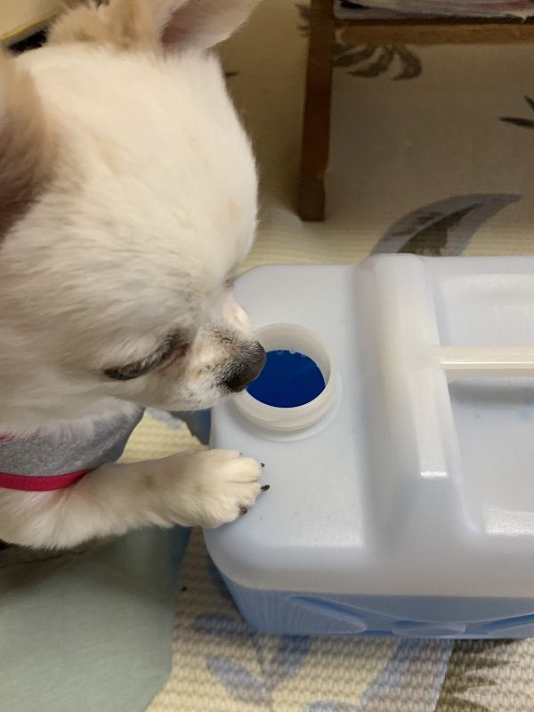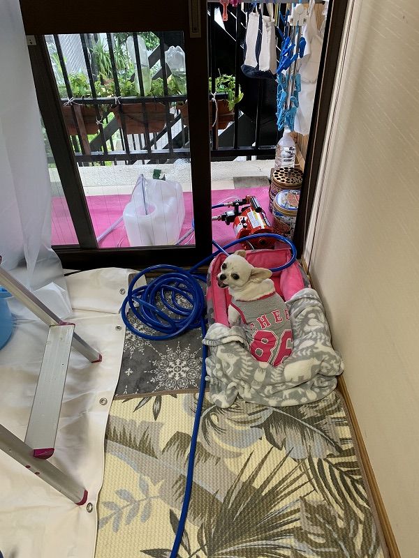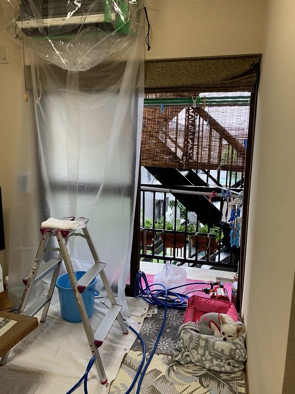 (今回は、あえてエアコン洗浄する横に犬のマットを置きました)