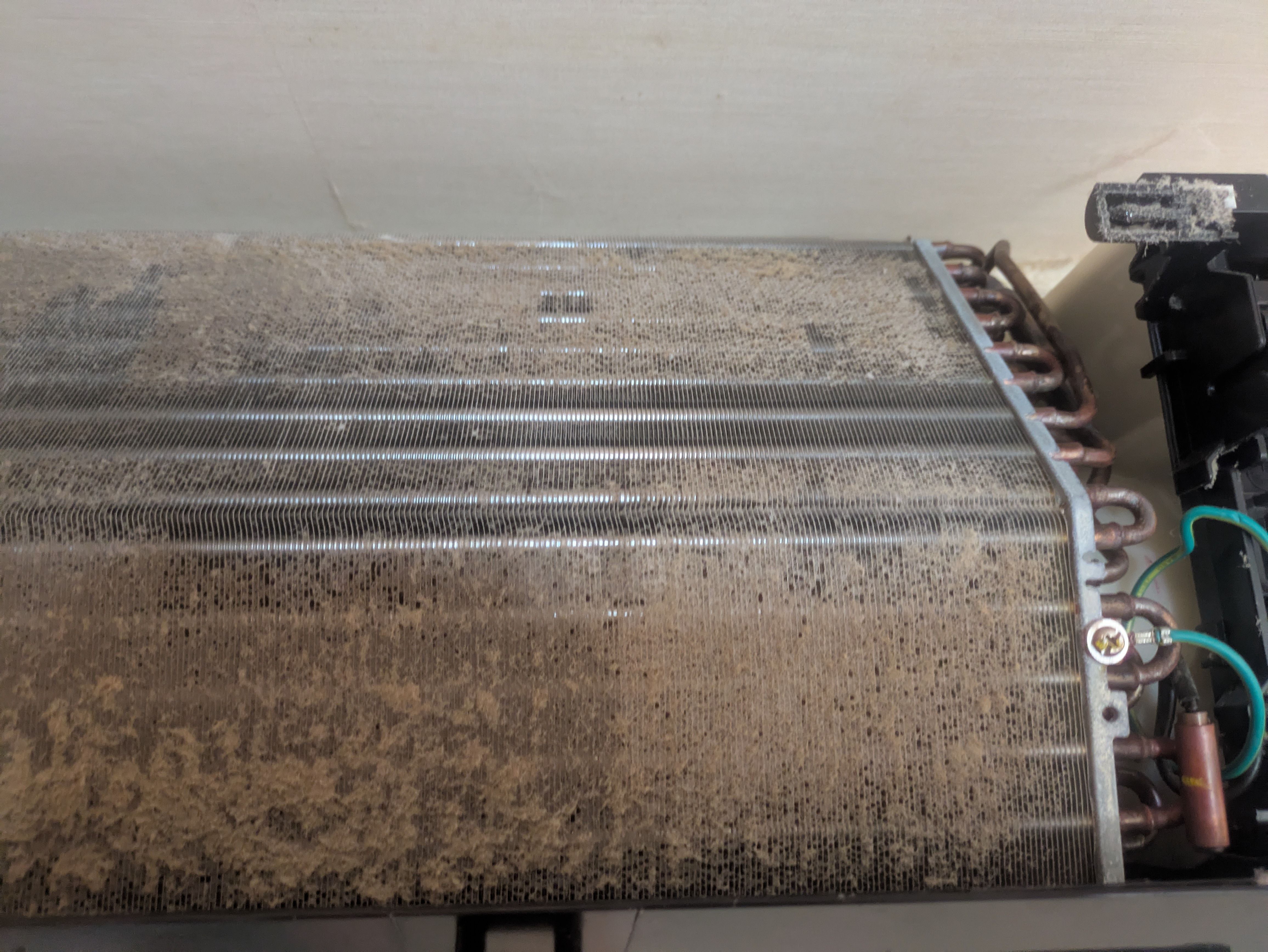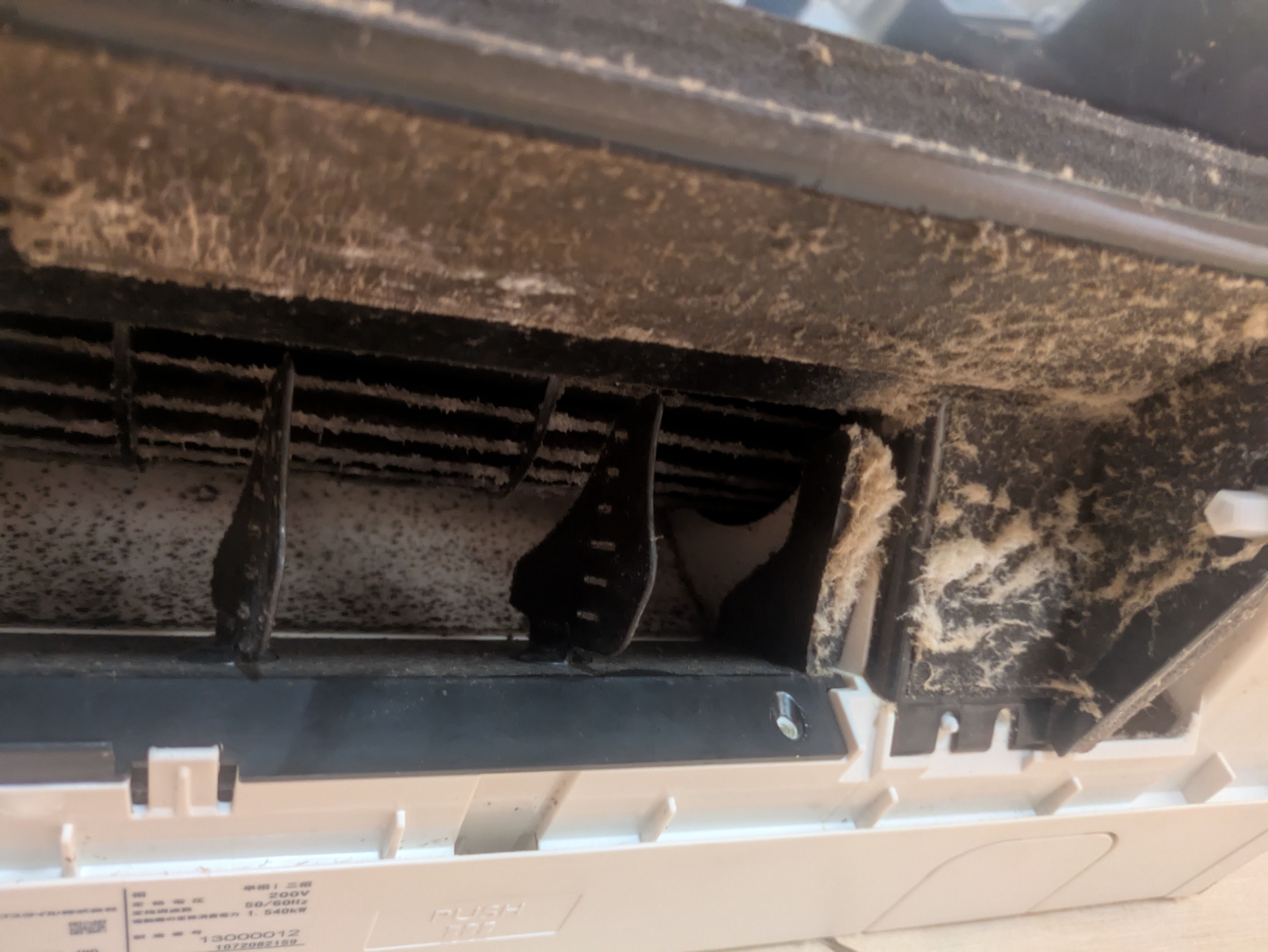 エアコン内部に溜まった汚れが排水を止めてしまい、室内に水漏れが発生します。