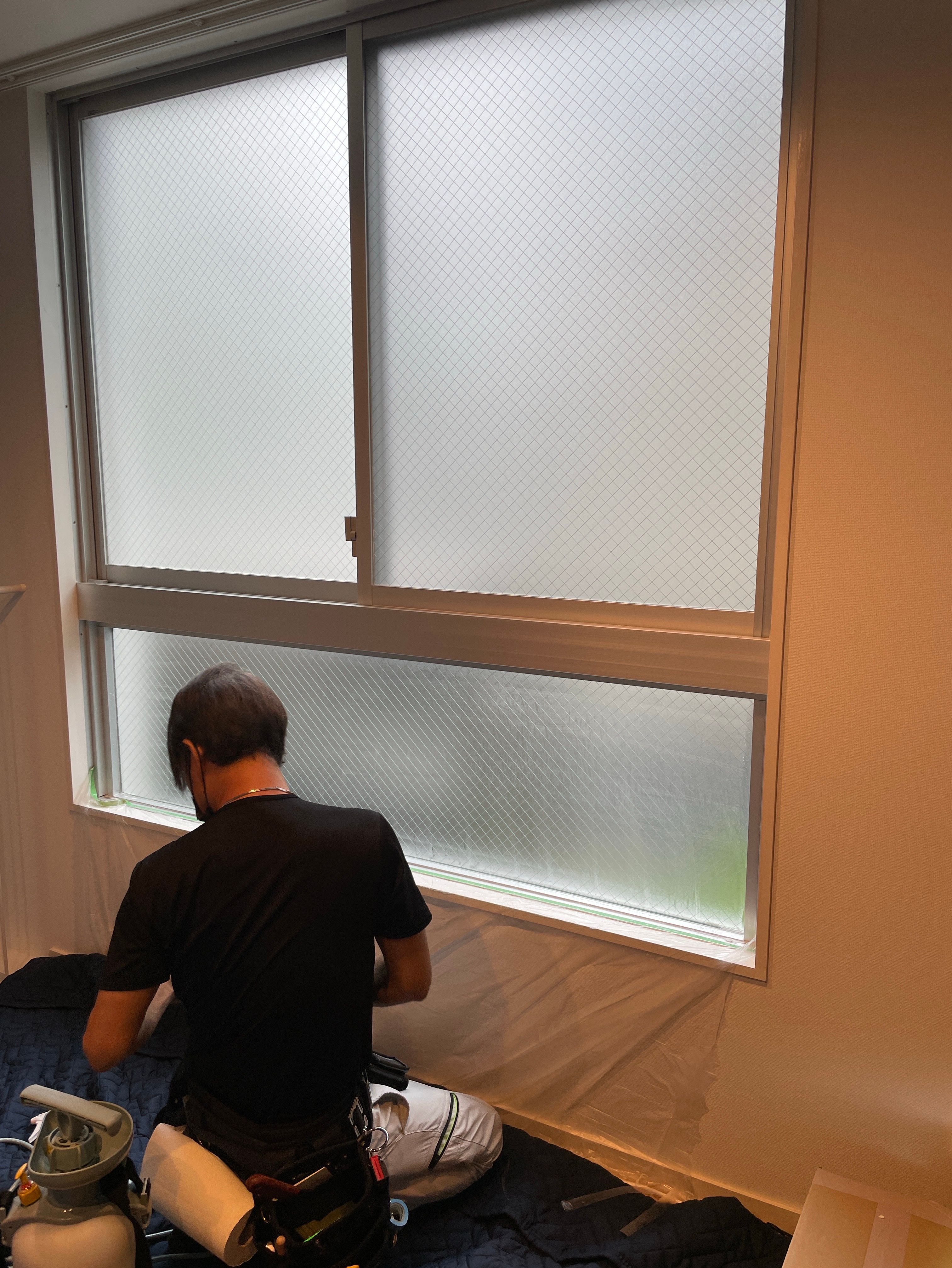 目隠しにも様々な物があり一般的なすりガラスタイプ、乳白色、ミラー、柄物など種類もたくさんございますのでお客様にサンプルを見ていただきフィルムを剪定させていただきます。