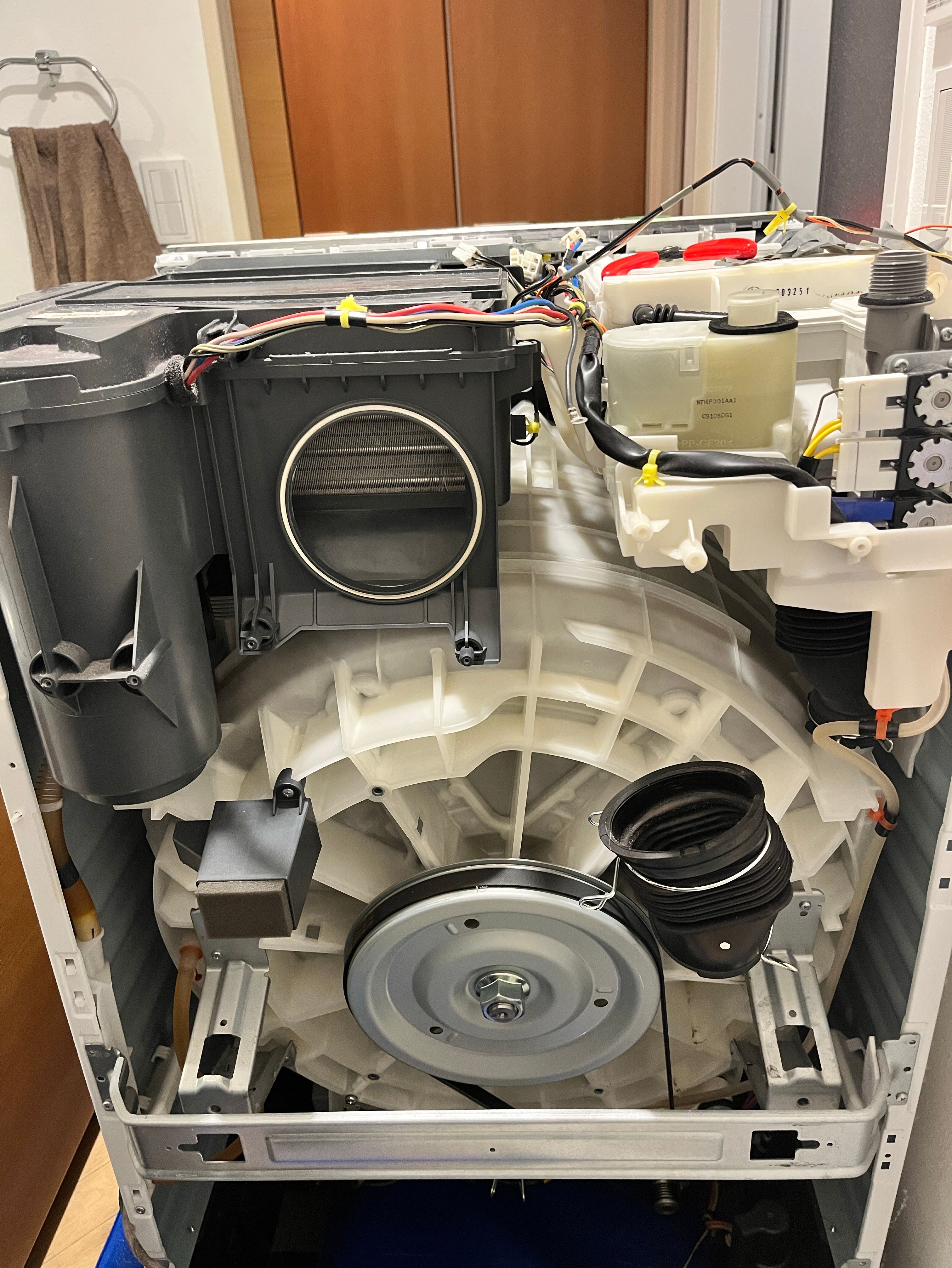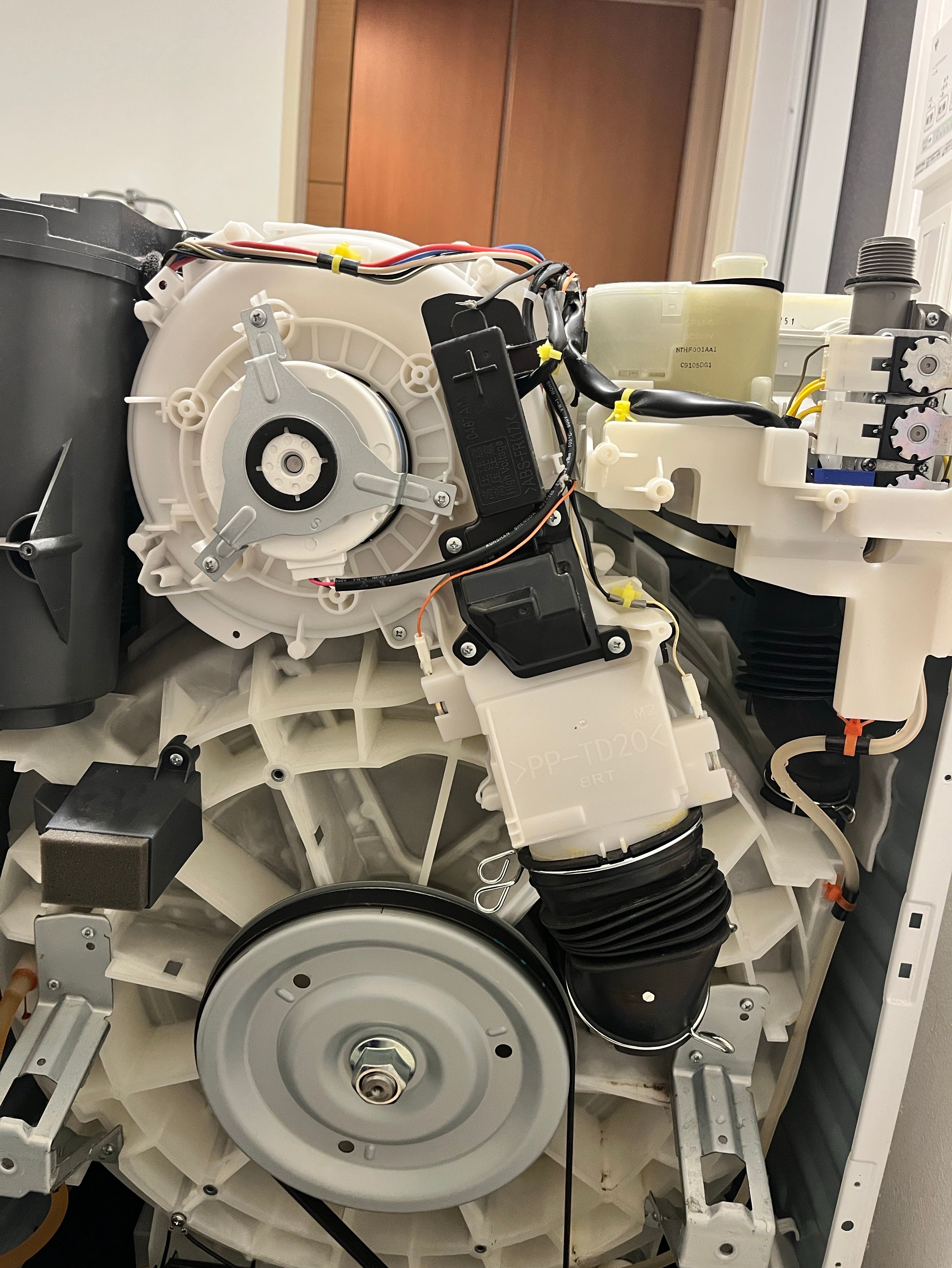 分解して点検すると、ヒートポンプ後方にある送風ファンモーターが固着しており、手で回しても動きませんでした。これでは風をドラム内に送ることができず、安全制御によりH59が表示されます。
