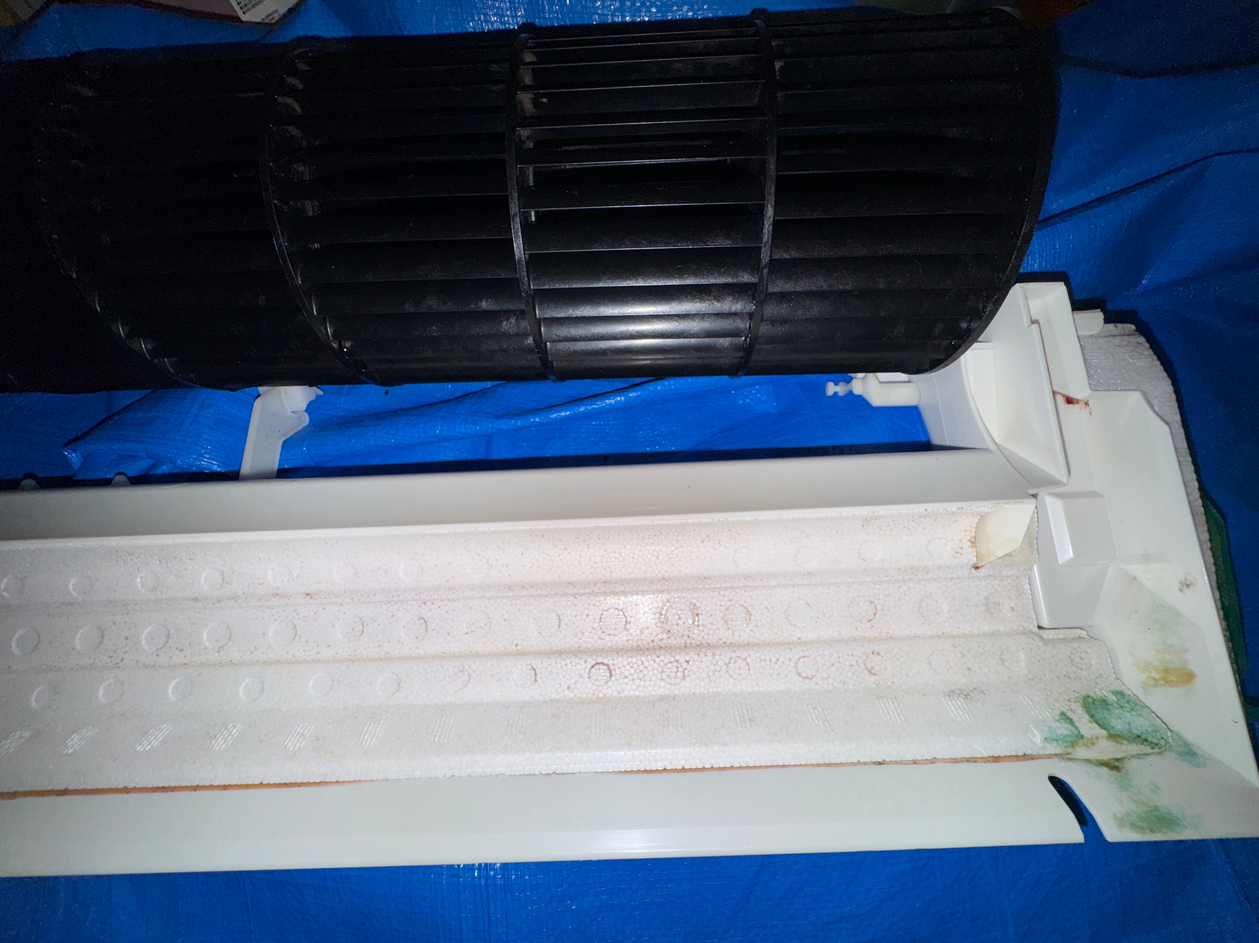 完全分解でしたのでお風呂場でドレンパン及び送風ファンも高圧洗浄機を使用してしっかりと汚れを除去。