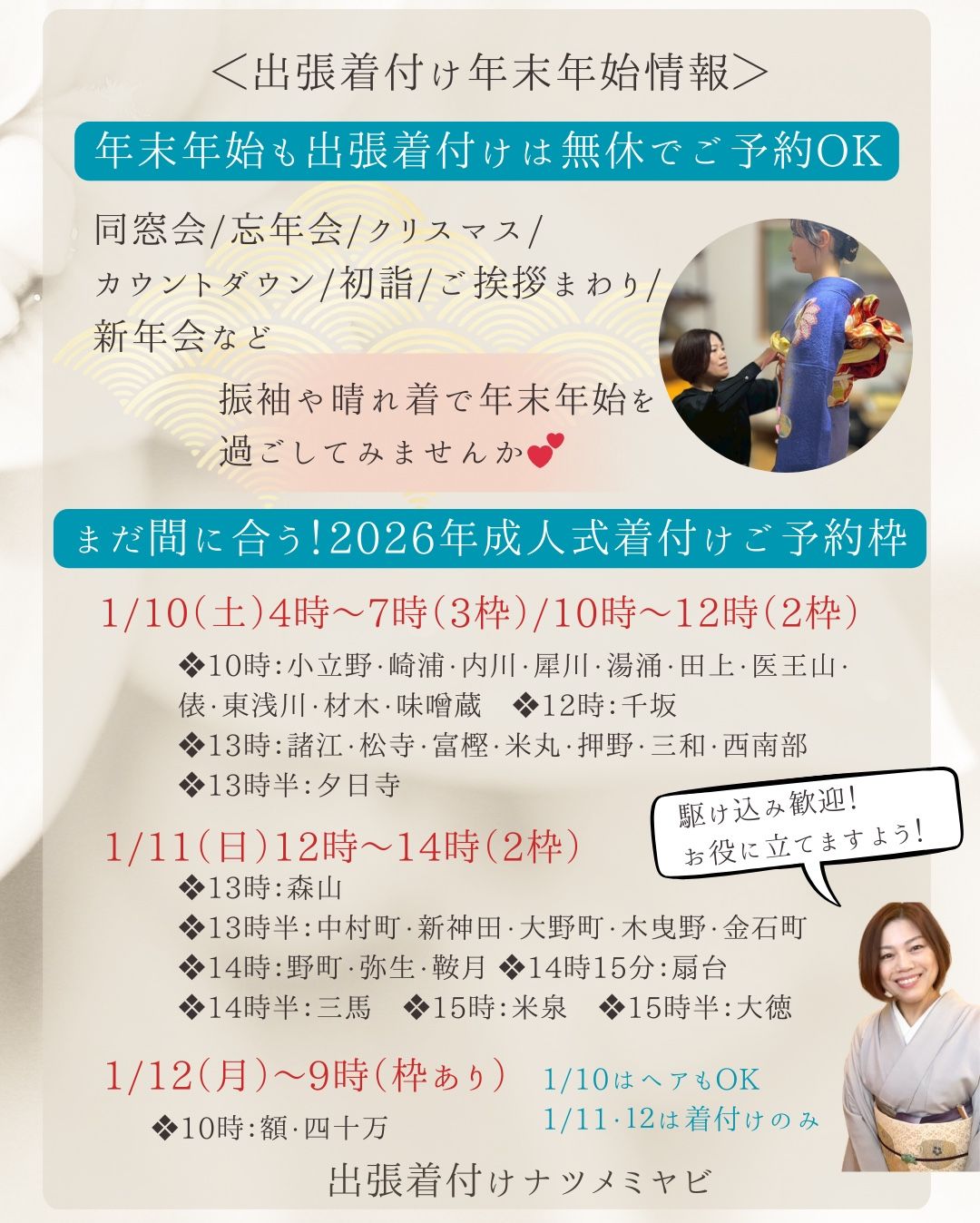1️⃣出張着付けは年末年始は無休でご予約🆗