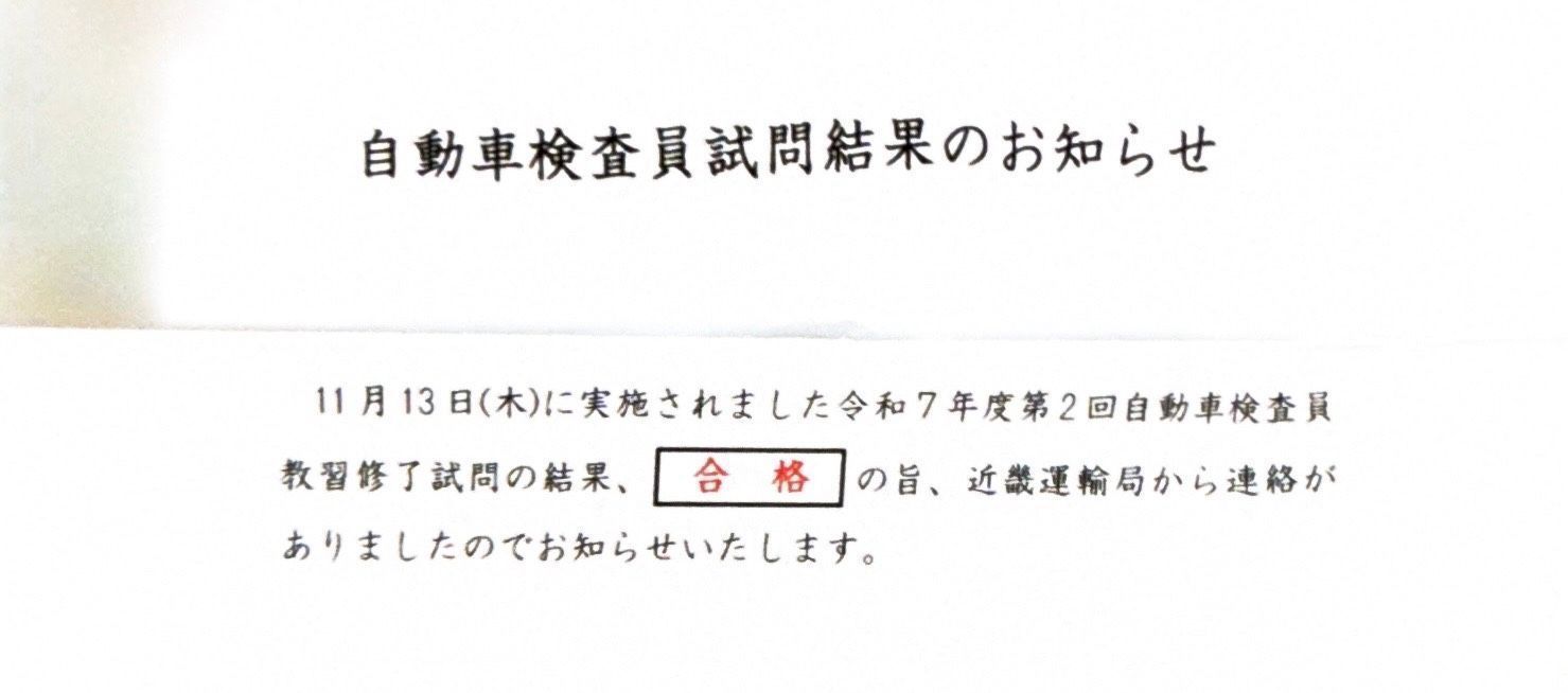 スキルアップとして “自動車検査員” の資格にも合格しました。
