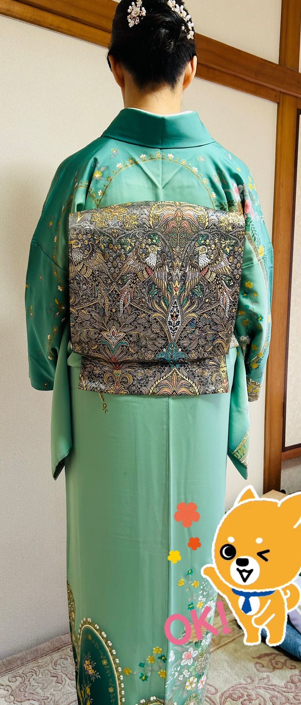 今日は、ご主人のお友達の息子様の結婚式にご出席される奥様の訪問着と二重太鼓のお着付けをしました。帯も落ち着いたグリーン系でとても重厚感があり、素敵な装いでした。後ろ姿があまりにもきれいでしたので、ブログにアップさせていただきました😌
