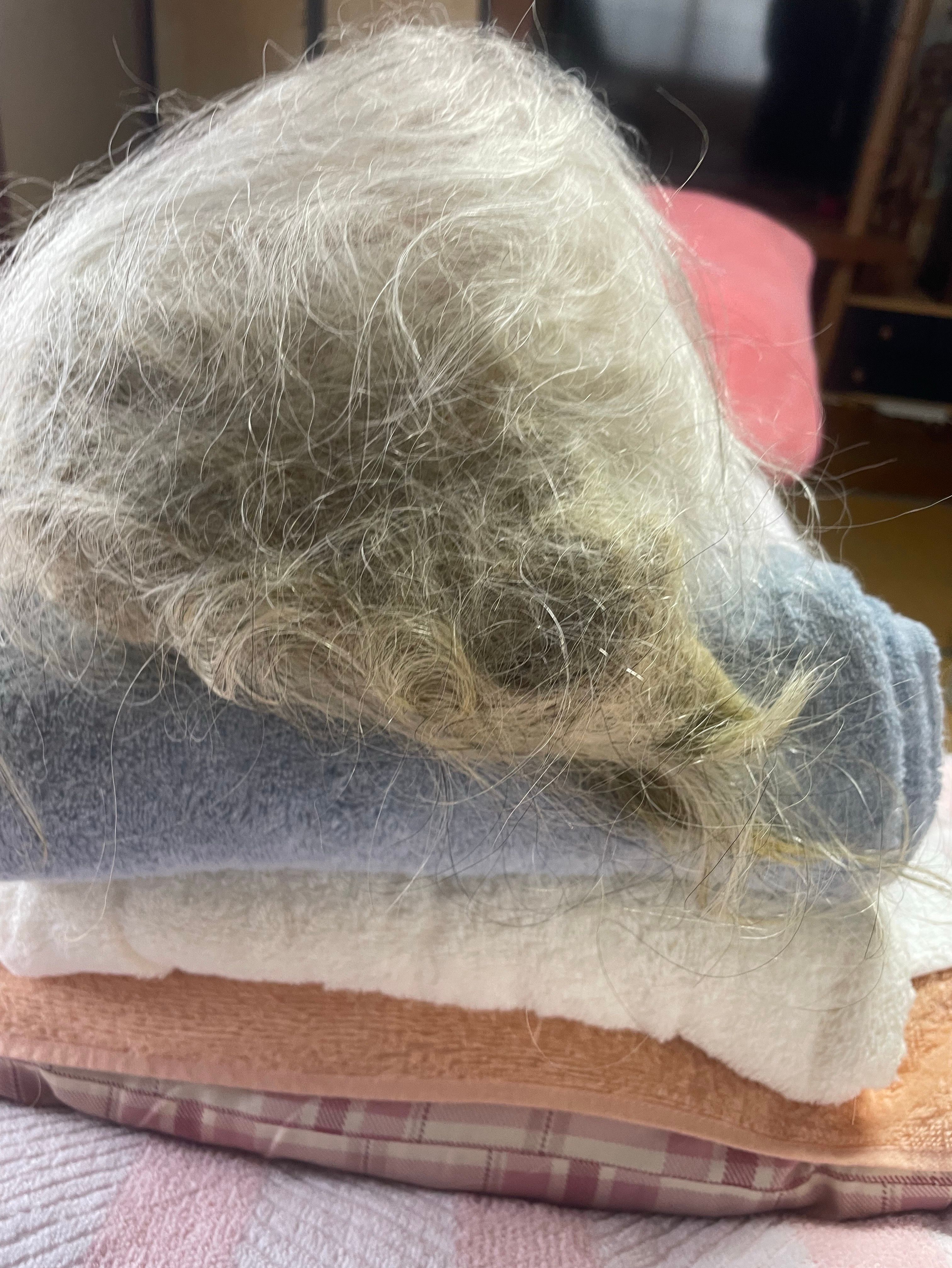 長い間ベットに横になっていた状態でシャンプーする事が出来ず、絡まってしまっていました。元々の髪の毛はボブくらいの長さだったそうですが、毛が細いこともあり後頭部は抜け毛が絡まり固まりになっていました。