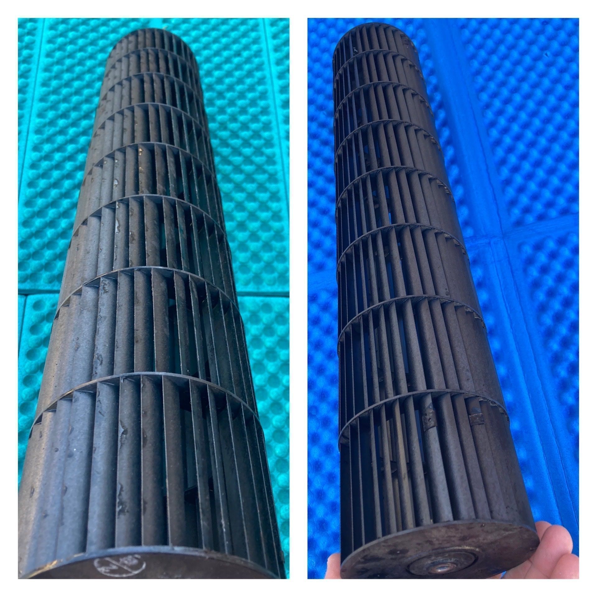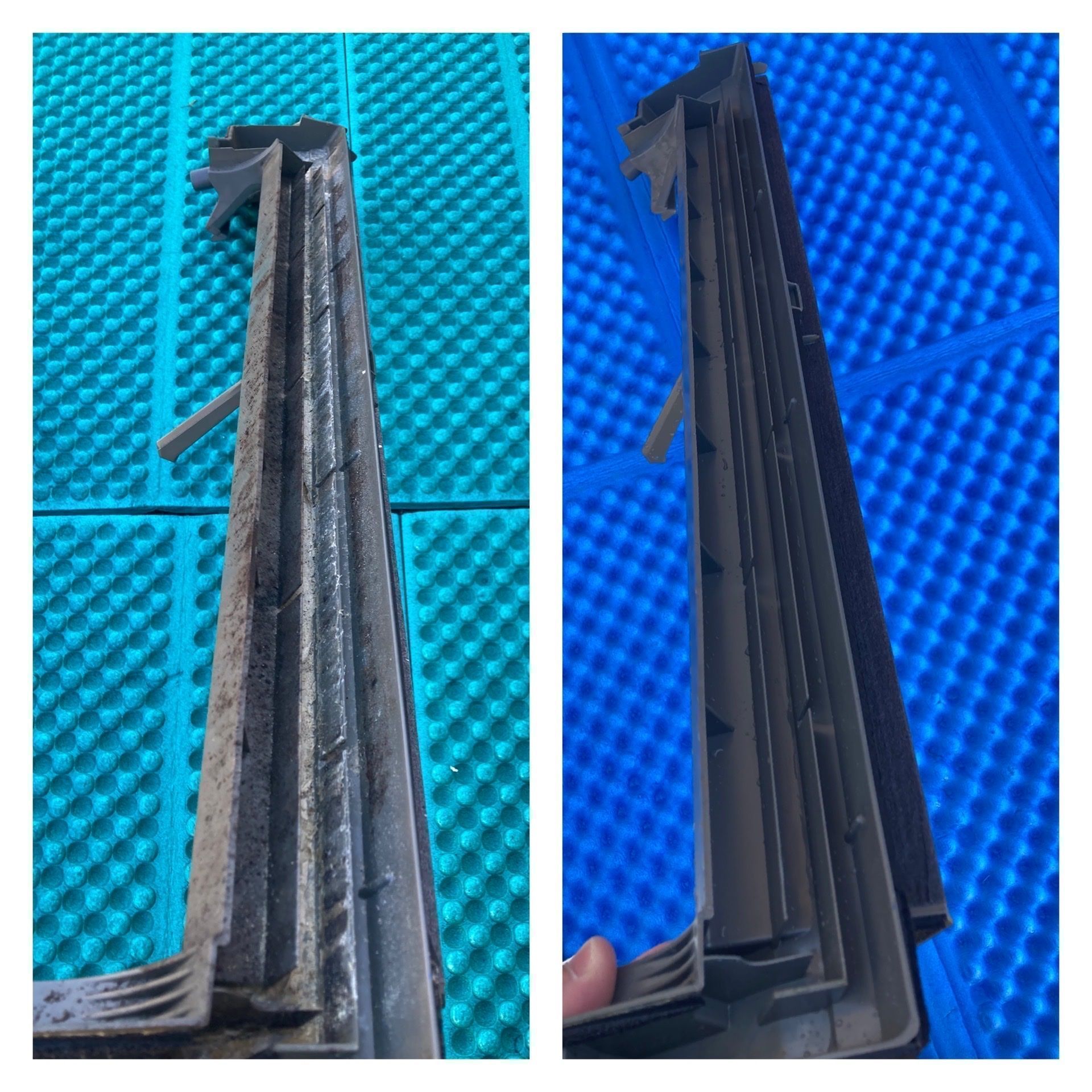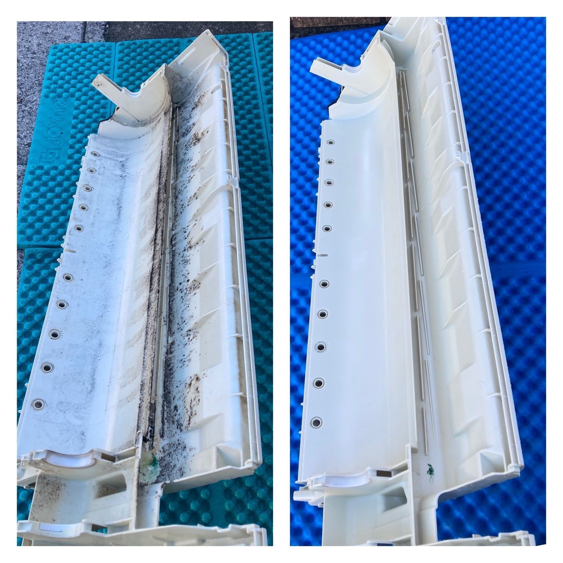過去に自分で分解クリーニングをしたエアコンとなります。ドレンパンには前回洗浄時の洗剤残りがありました。水でしっかりすすいだつもりでも洗剤残りがあるケースが多いです。