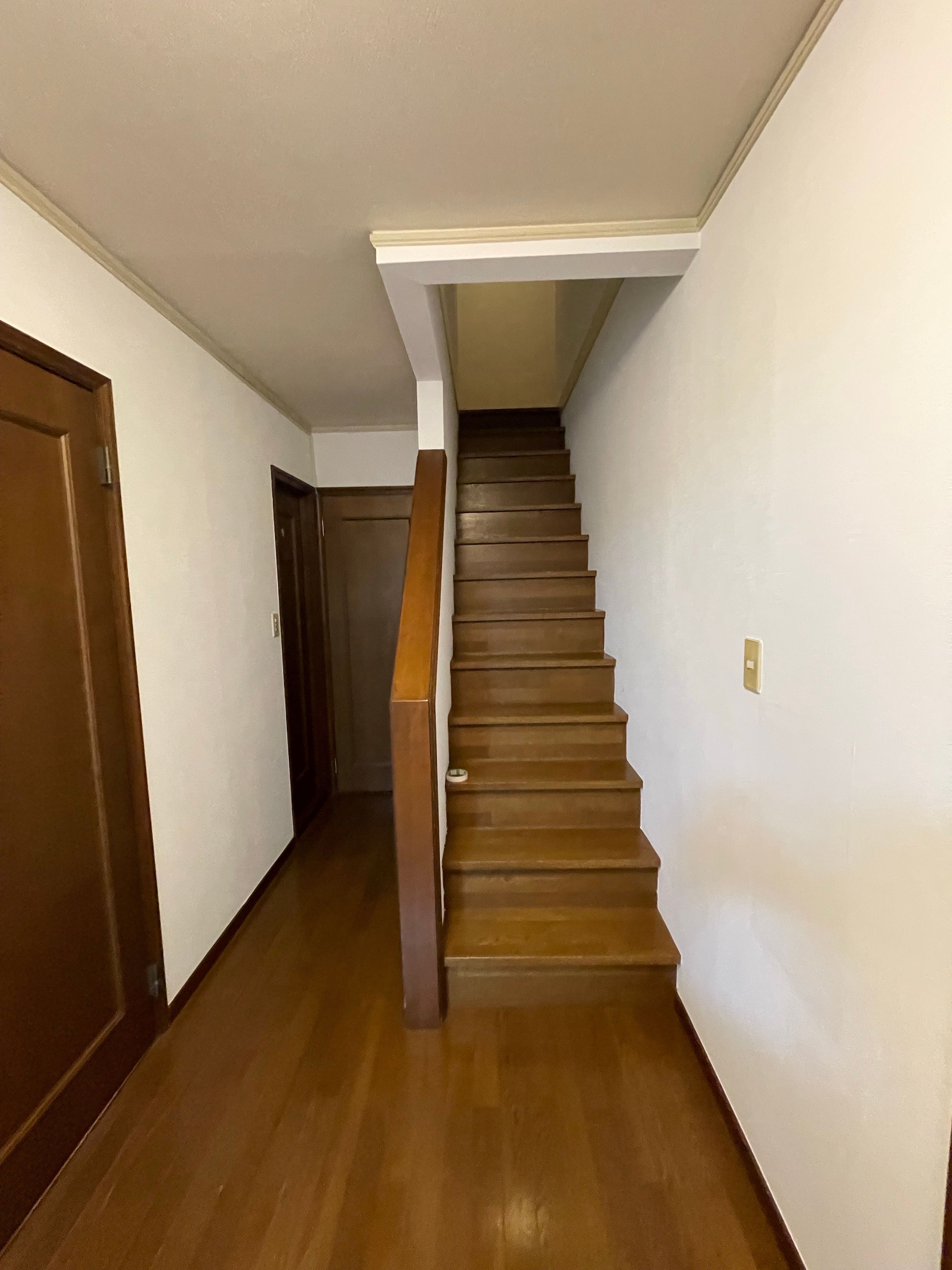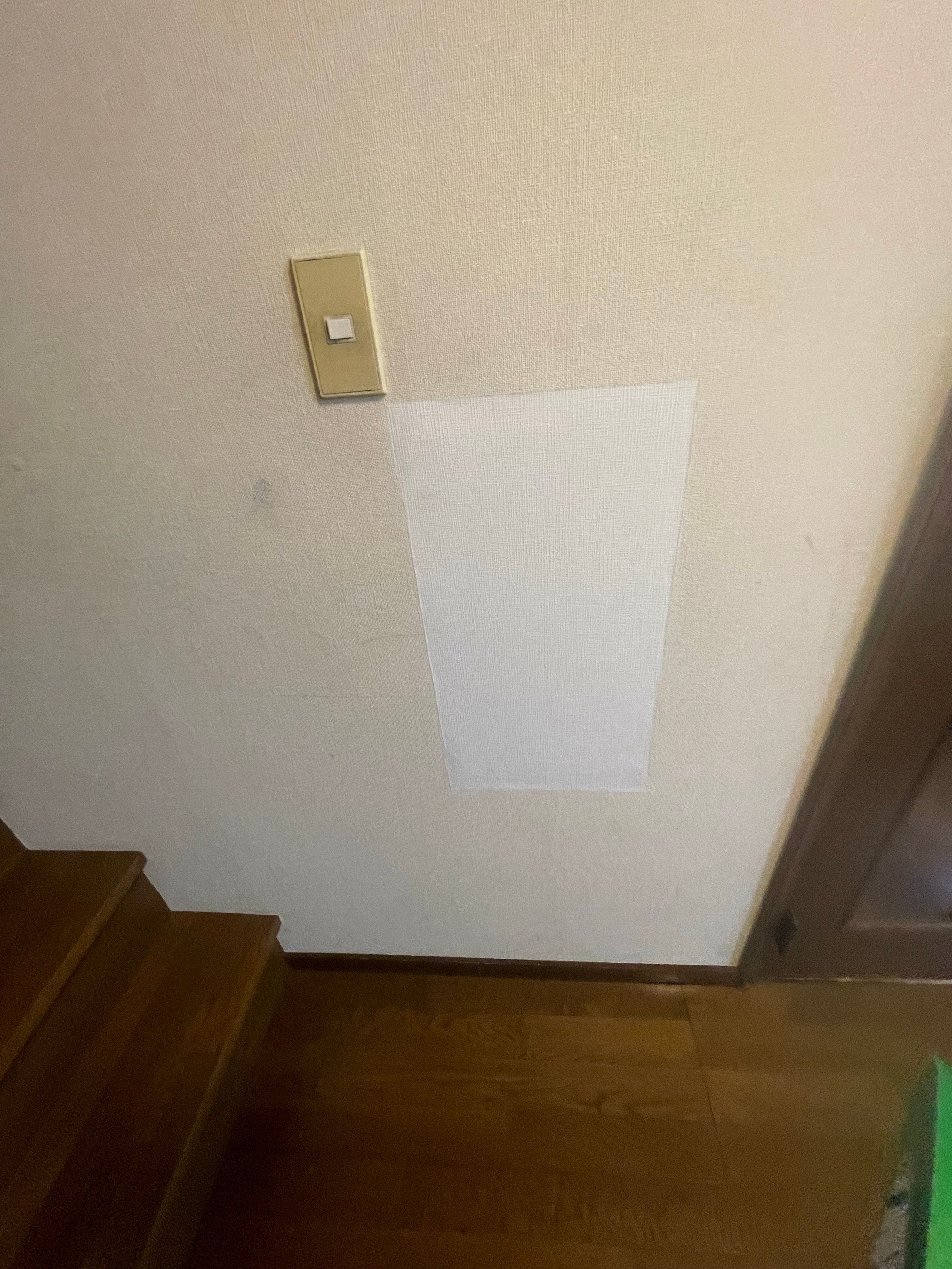 玄関・廊下のスイッチ近くに大きな壁穴ができてしまい、壁穴補修後に似た壁紙を張らせていただきました🫡