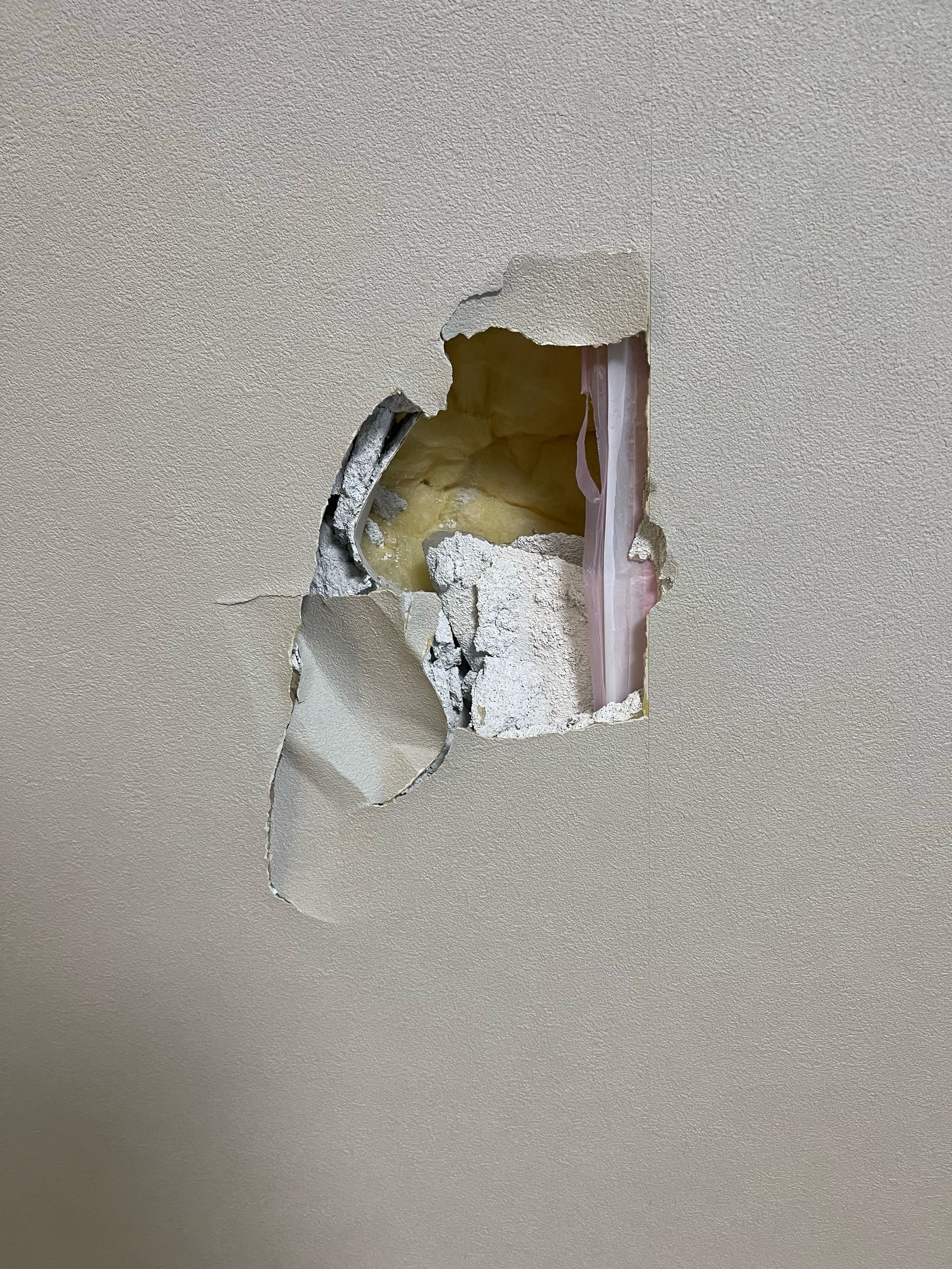 私共の壁穴補修方法は、まず壁穴部分をキレイに切り抜き、下地となる木部、石膏ボードを復旧後にパテ(下塗り・上塗り)を塗り、最後に壁紙を張らせていただきます。