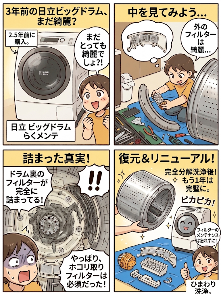 今回は、近年人気の高い**日立ビッグドラム(らくメンテ搭載モデル)**の分解洗浄の様子をレポートします。