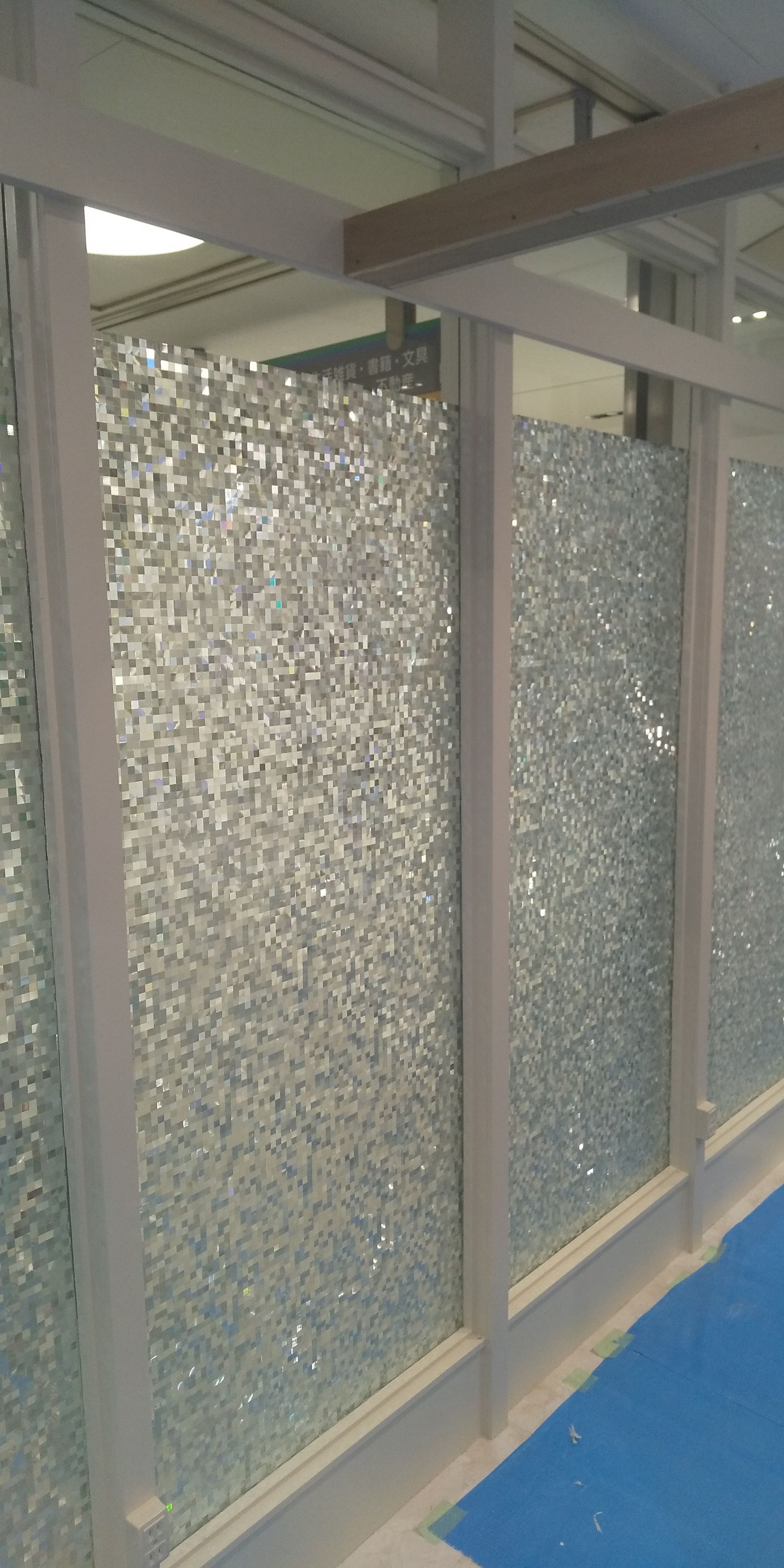 高さ2.2メートルほどあるガラスのうち高さ1.8メートルの高さまでモザイクキューブを貼りました。