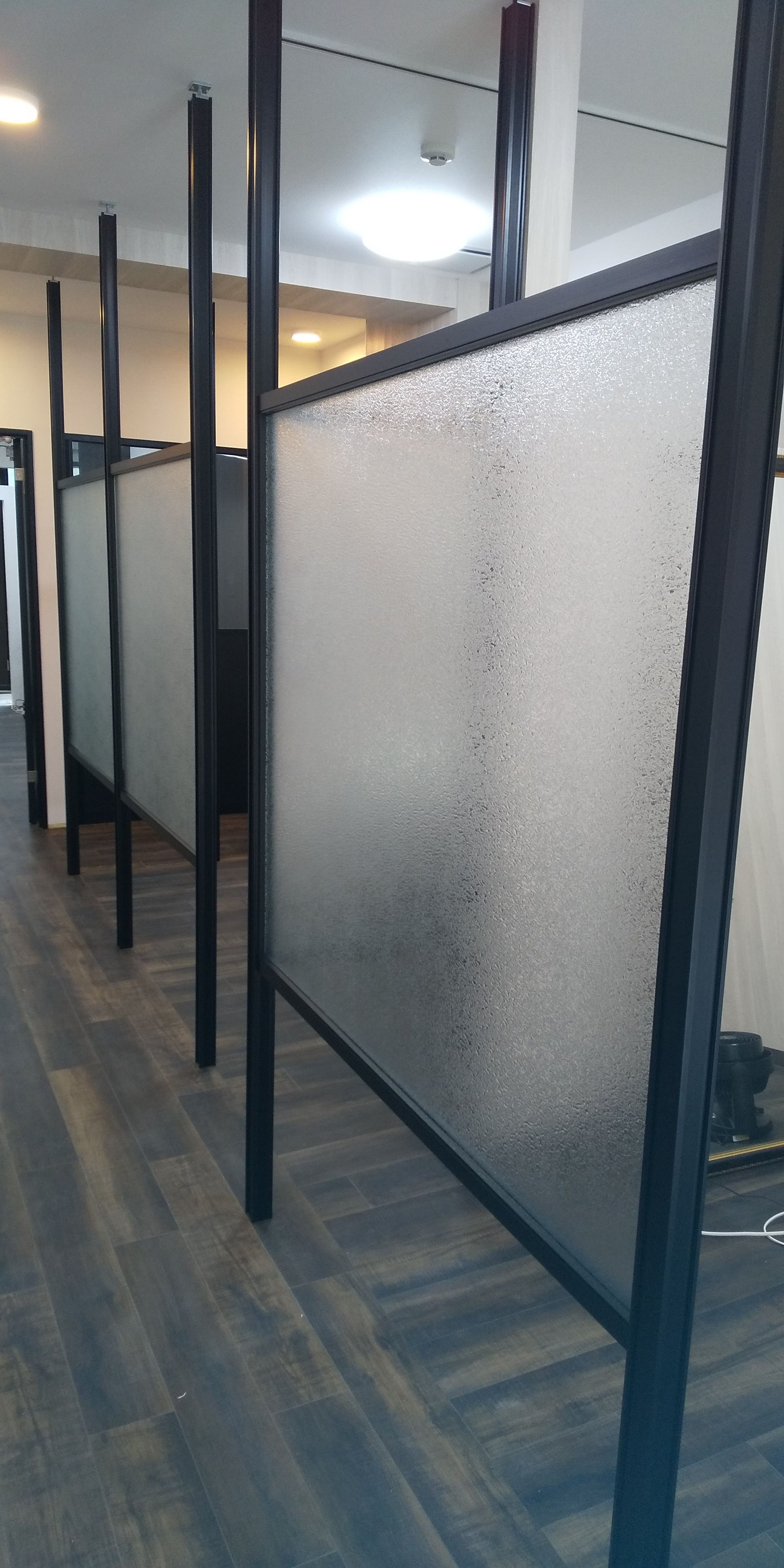 店内のパーテーションのガラスにサンゲツの型板調フィルム「レトロ」を貼りました。