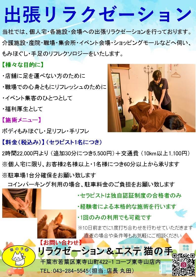 猫の手のベテランスタッフが個人宅・介護施設・産院・職場・集会所・イベント会場・ショッピングモールなどへ伺い、もみほぐしやリフレクソロジーを行います。