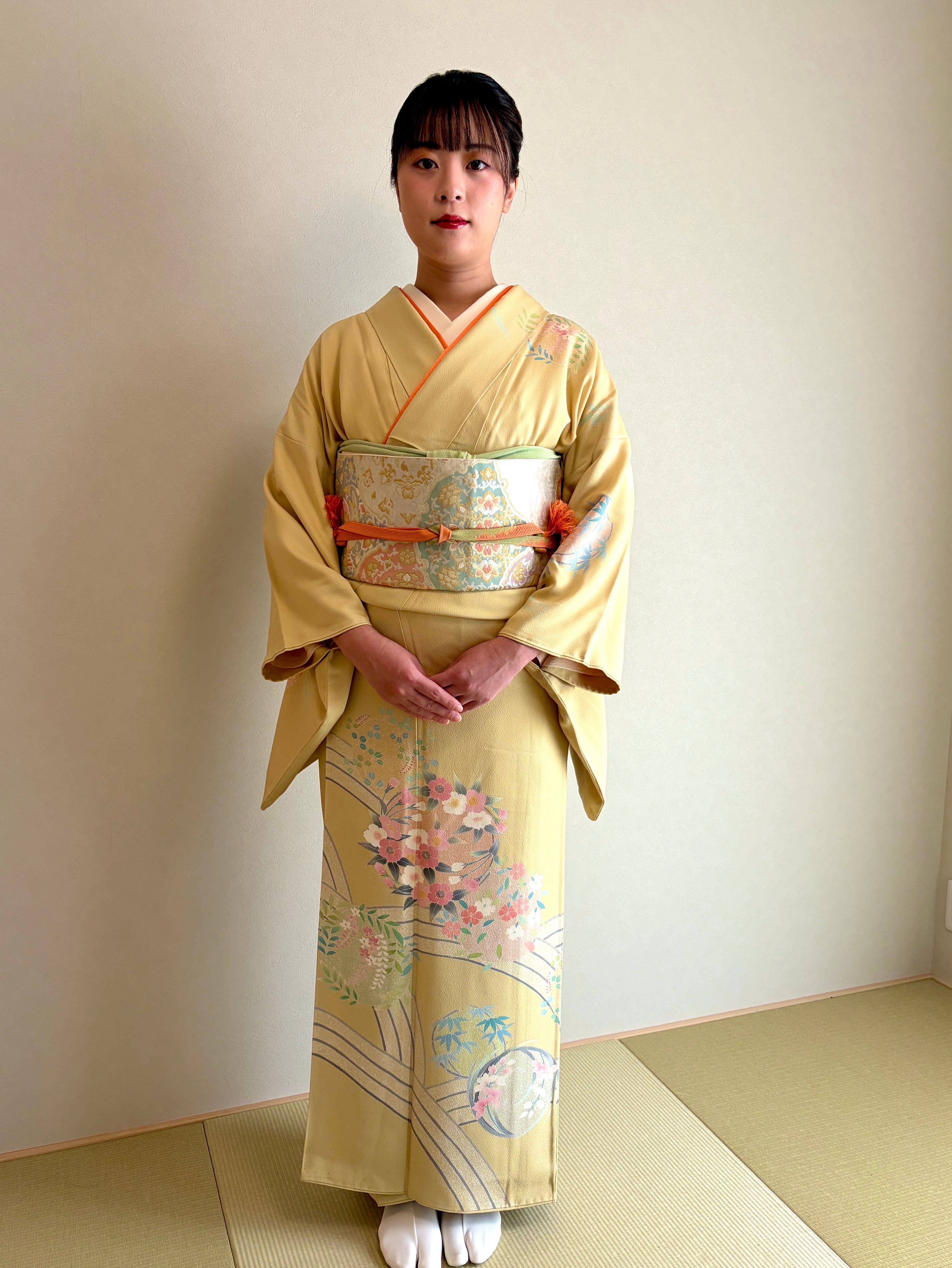 帯や小物まで、コーディネイトも完璧なお着物姿です。長い間着れる色目の訪問着は、帯や小物をチェンジして活躍しそうですね。