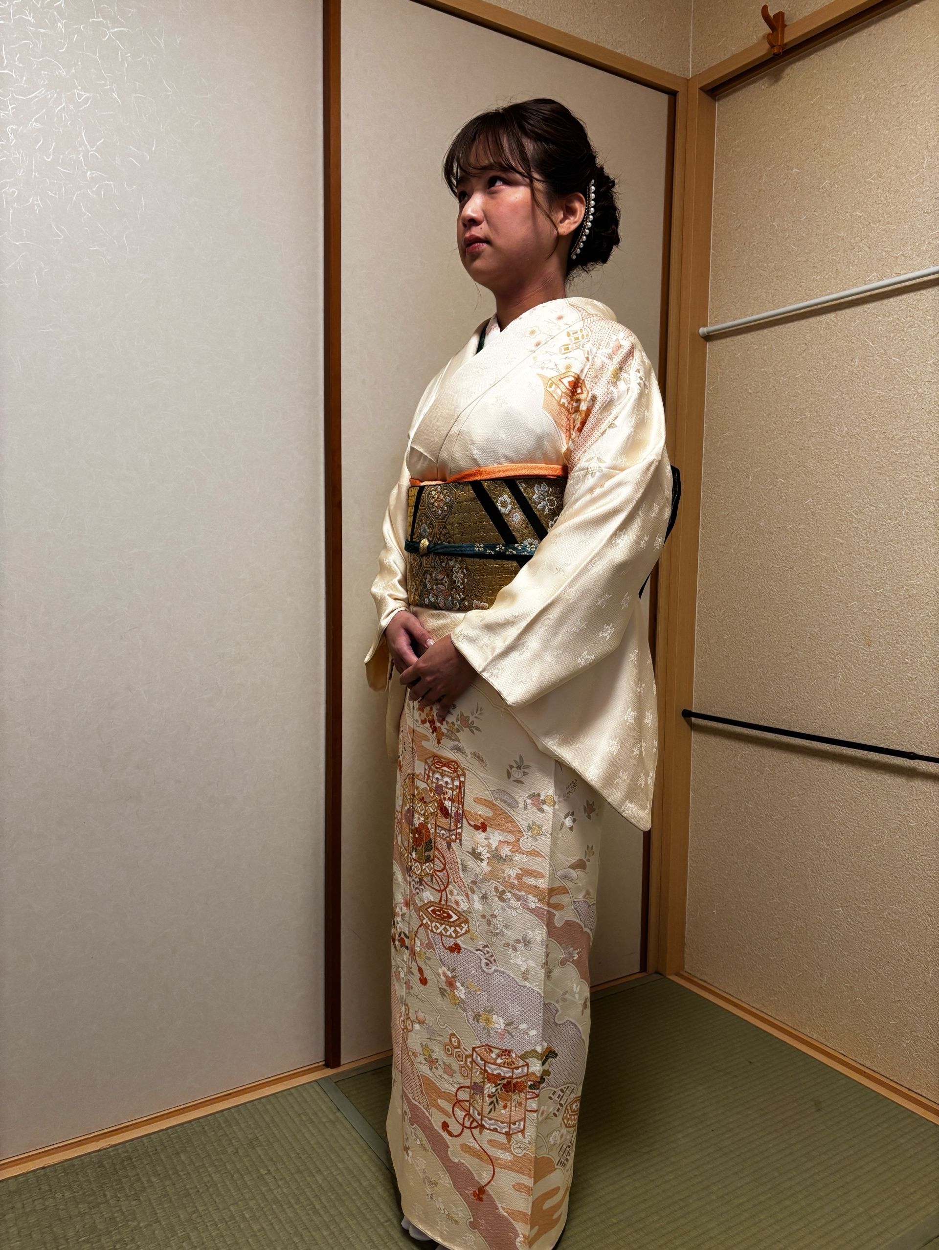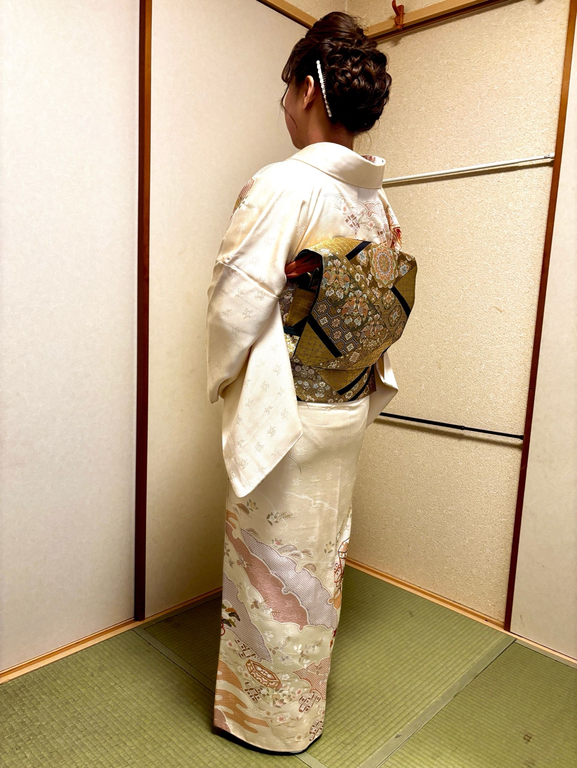 もうお一人は白地訪問着に、金地の袋帯を合わせが上品です。小物のグリーン帯締めとオレンジの帯揚げが差し色になっています。