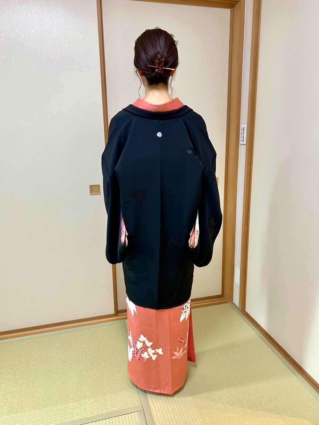 お一人目は、鮮やかな付下げに黒紋付き羽織をあわせて。紋付き羽織をお召しになると着物の格が上がりますね。黒と鮮やかなお着物のコントラストがお洒落です。