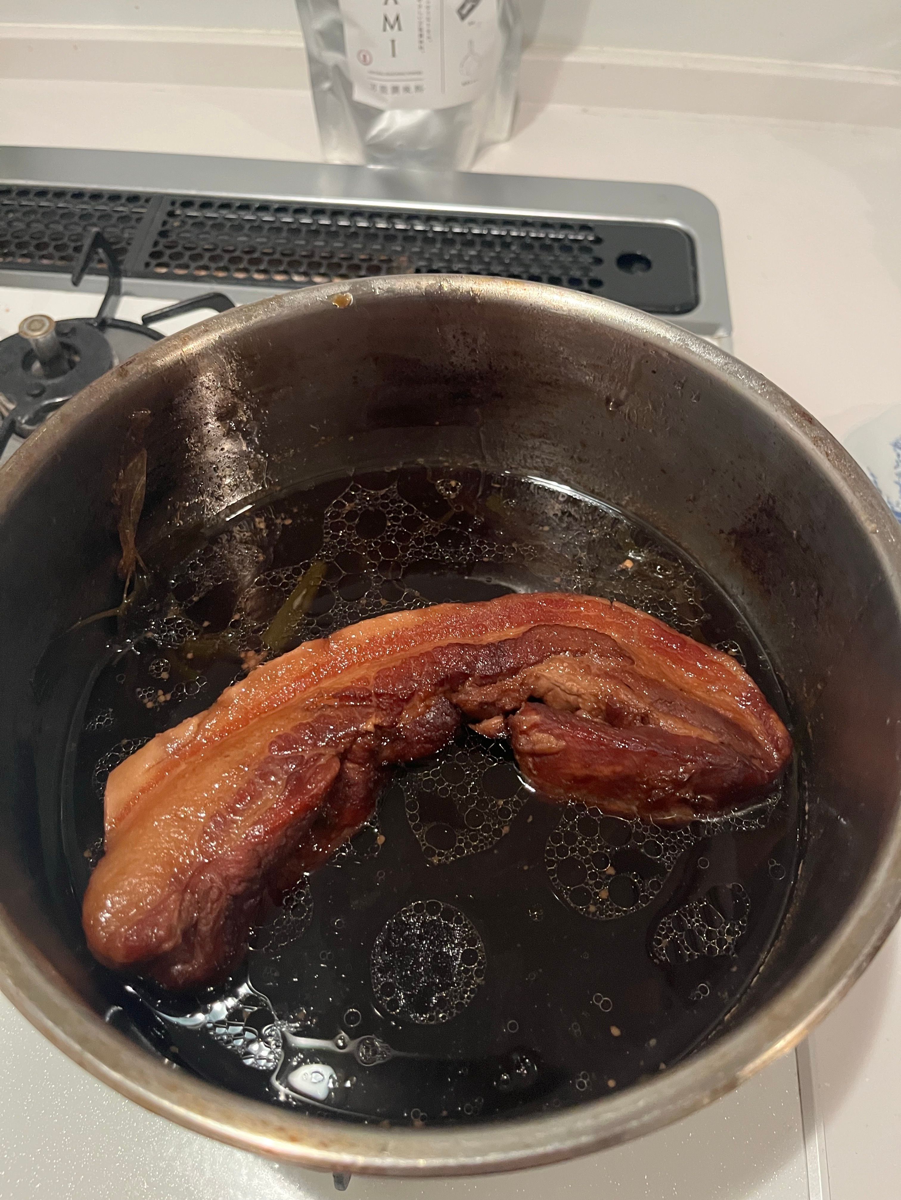 3.Aに豚バラブロックを入れ、Bの水をヒタヒタになるまで入れる。