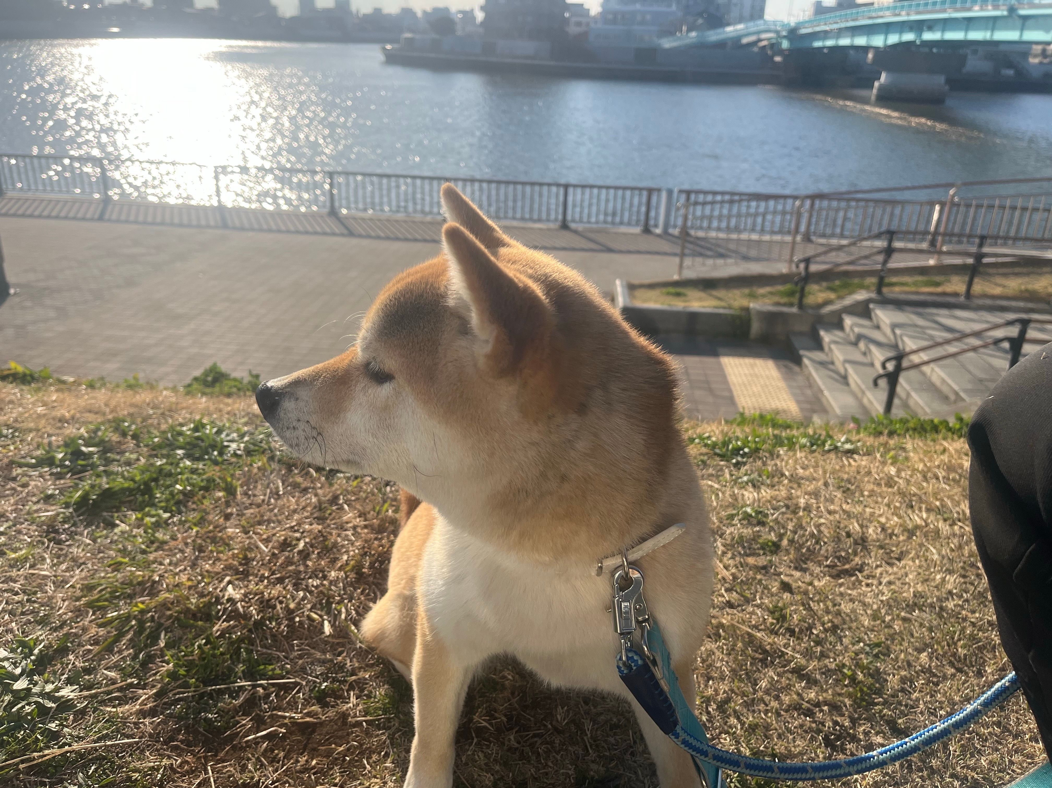 道ゆく人に「可愛いね」と声をかけられ、少し得意げに胸を張る凛々しい立ち姿。水辺の青と、柴犬の赤毛(茶色)のコントラストがとても綺麗で、思わず何度もシャッターを切ってしまいました。