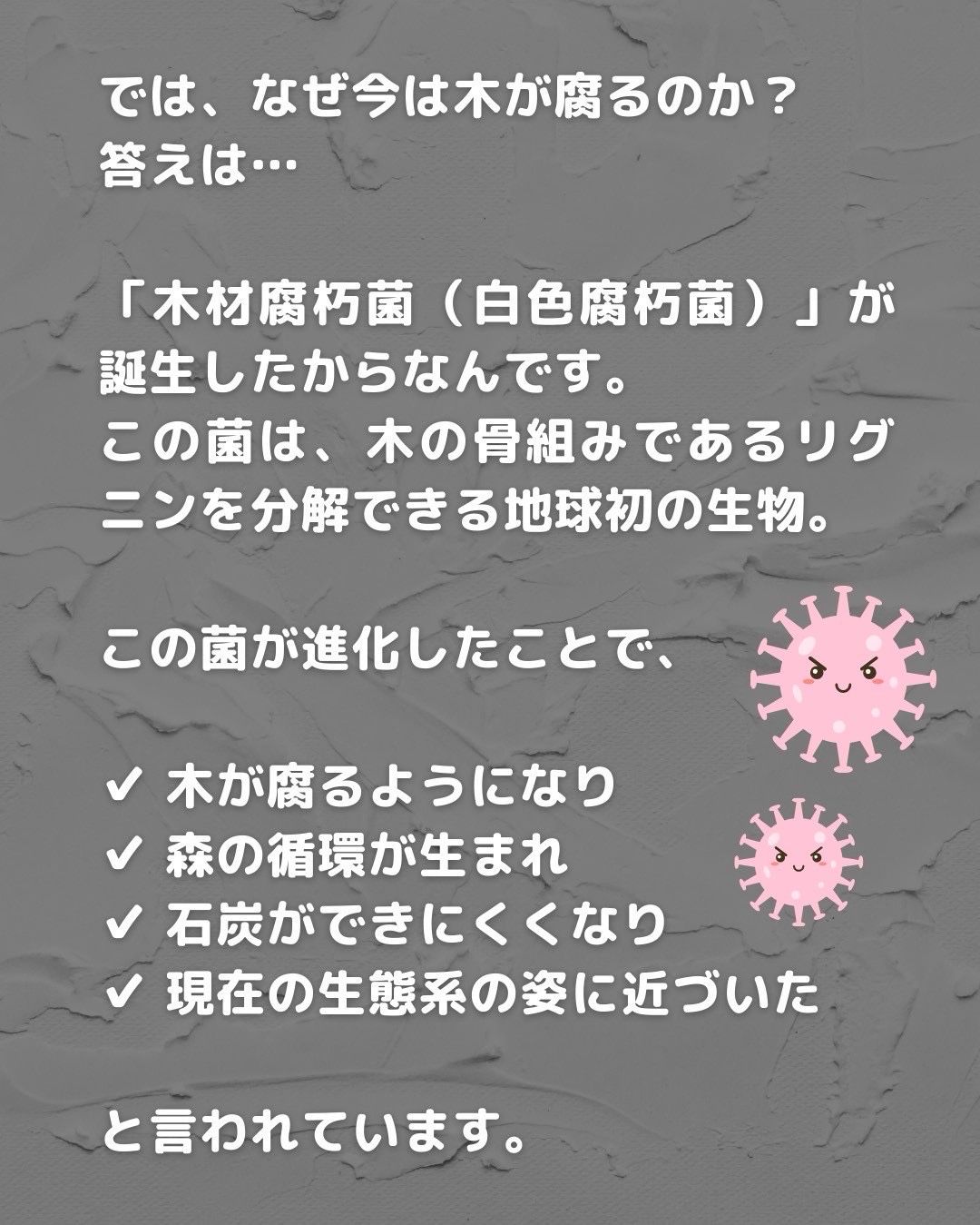 「木材腐朽菌(白色腐朽菌)」が誕生したからなんです。