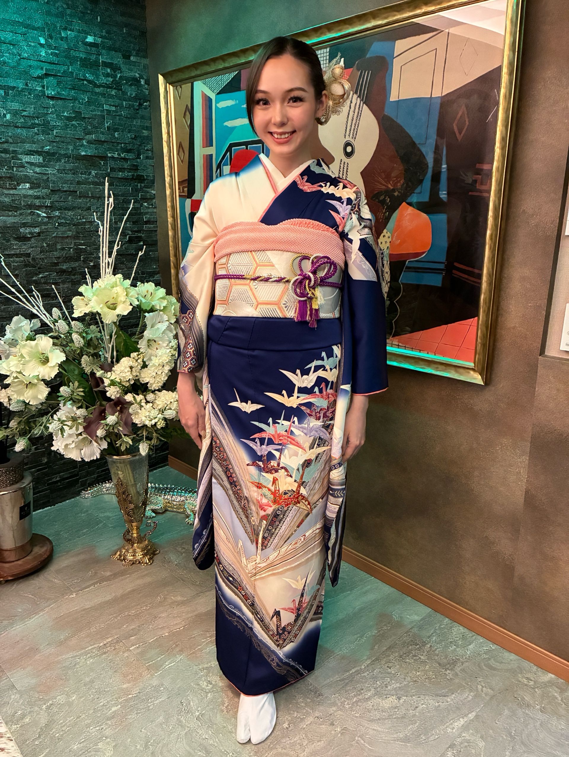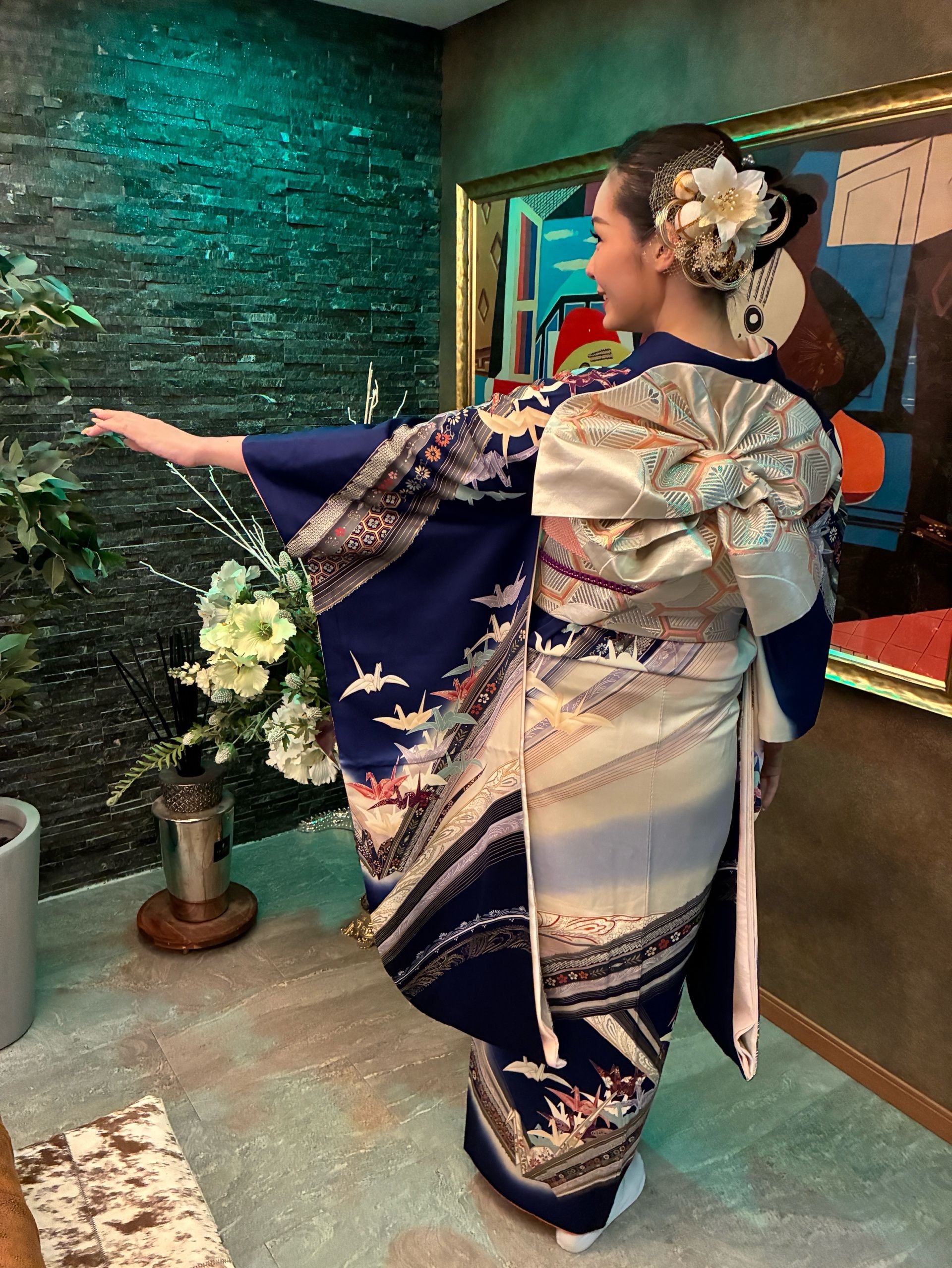 帯結びは、羽根を広げて飛んでいけるイメージで。
