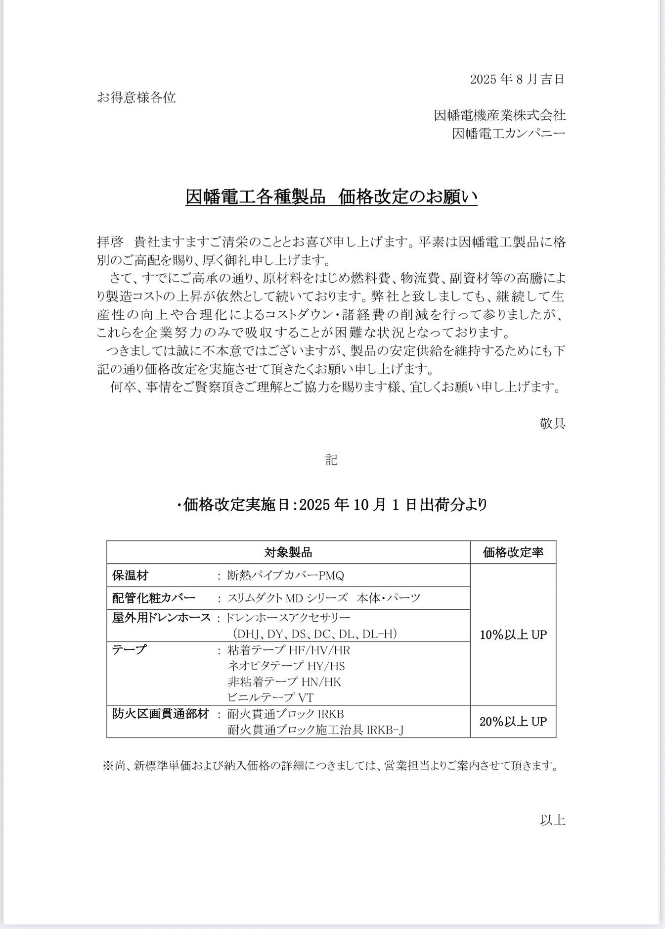 配管カバーや化粧テープなどの主要資材が10%以上の値上げ。。。