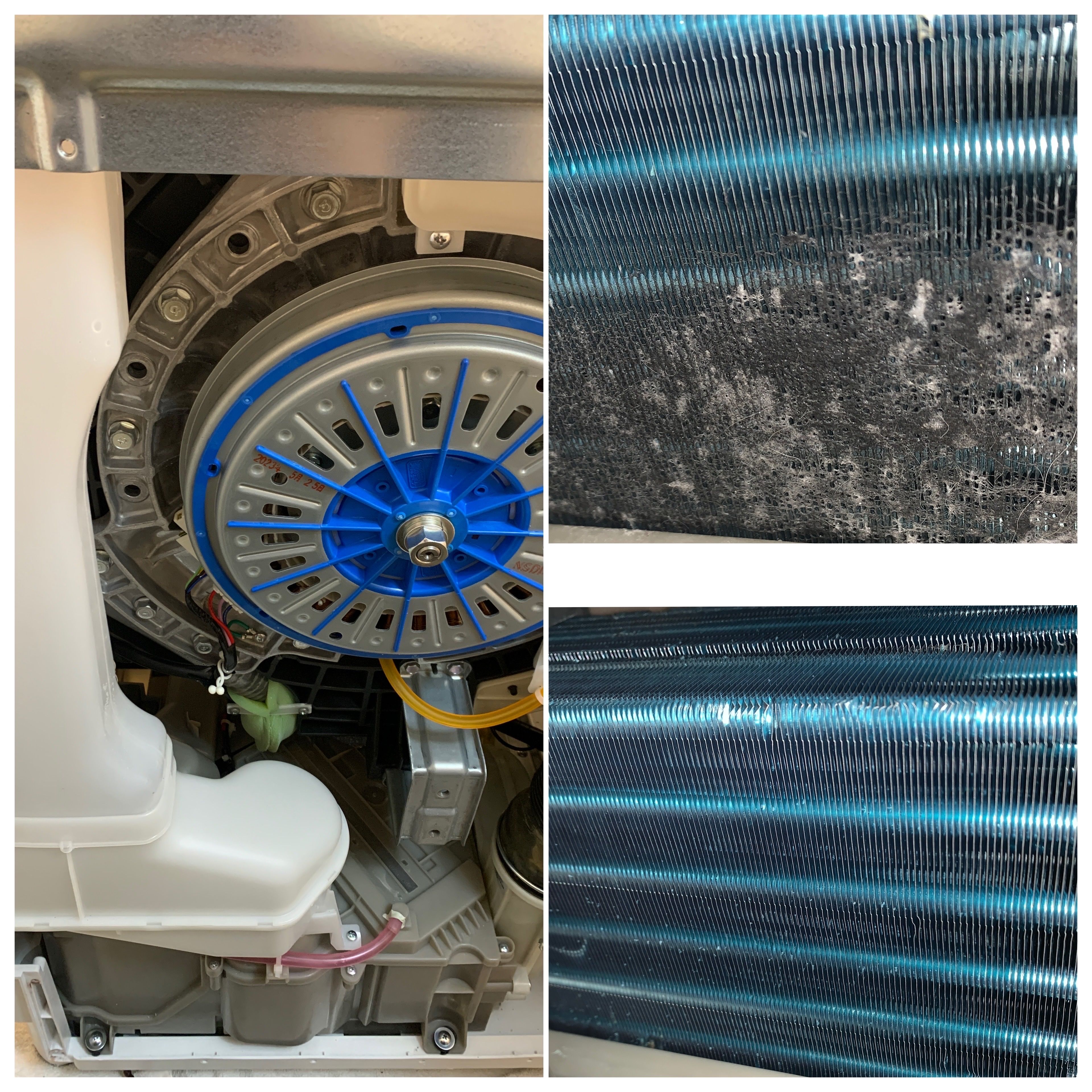 ヒートポンプや乾燥経路のパーツを分解して、しっかり清掃しました。Panasonic のドラム式であればヒートポンプを含めても3時間ほどで終わりますが、TOSHIBA は構造上どうしても時間がかかり、5時間前後必要になります。