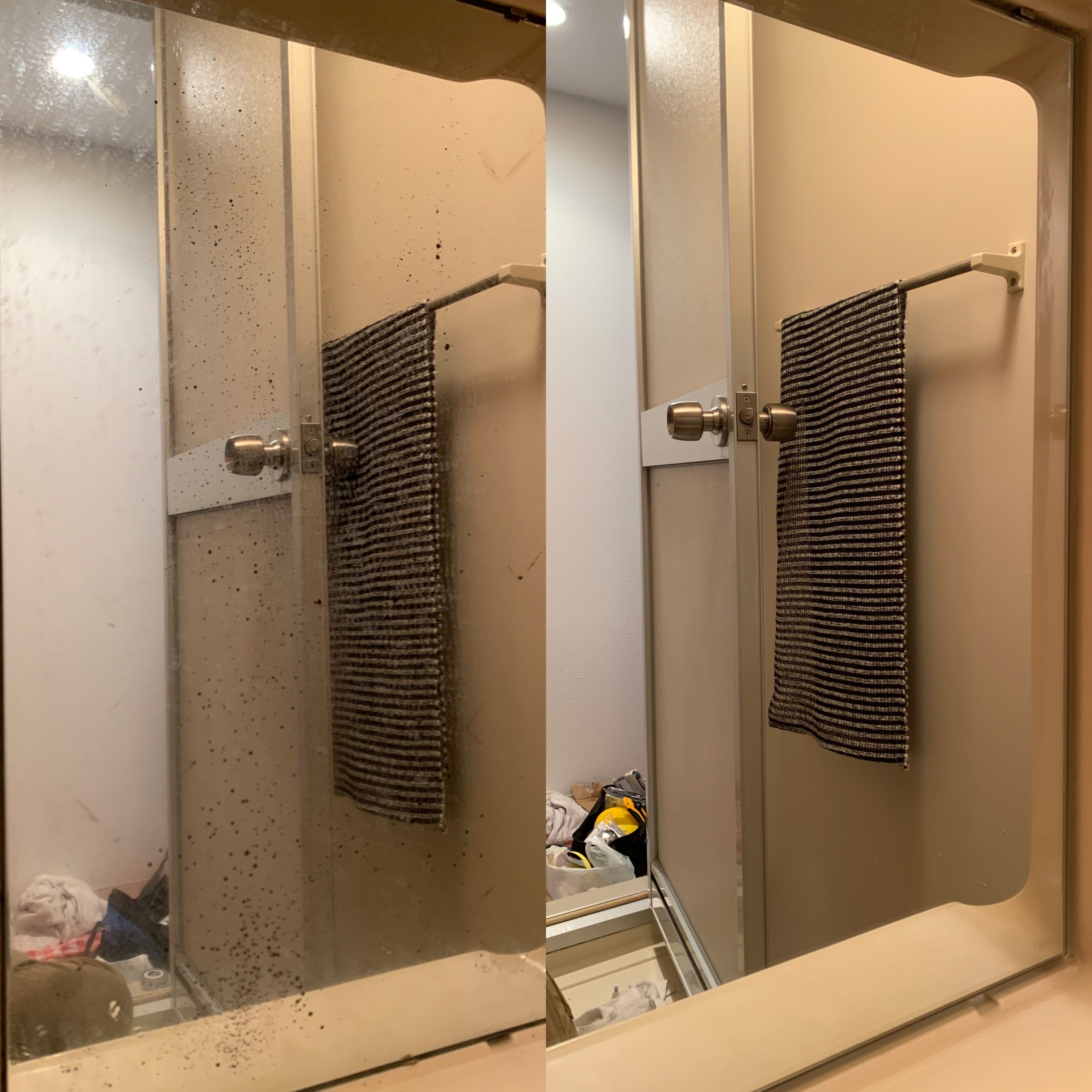 浴室の鏡は経年劣化による裏側のサビが表面に出てきていたため、研磨では改善できず、交換対応をいたしました。