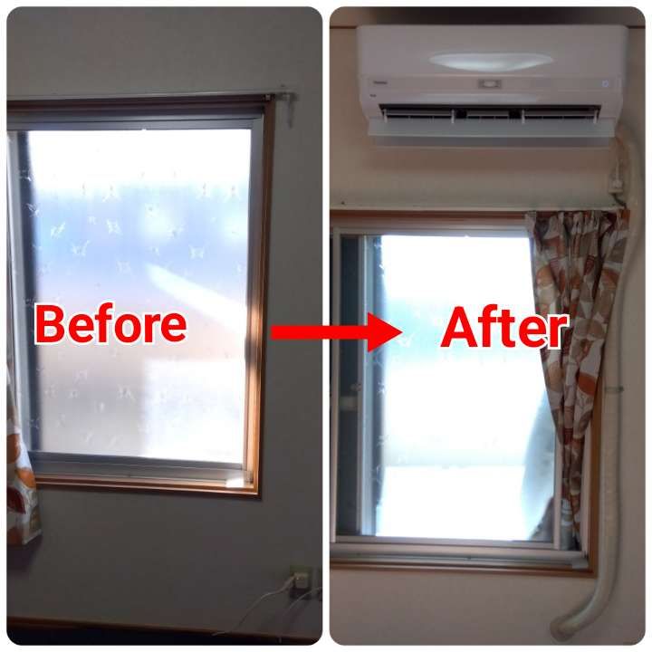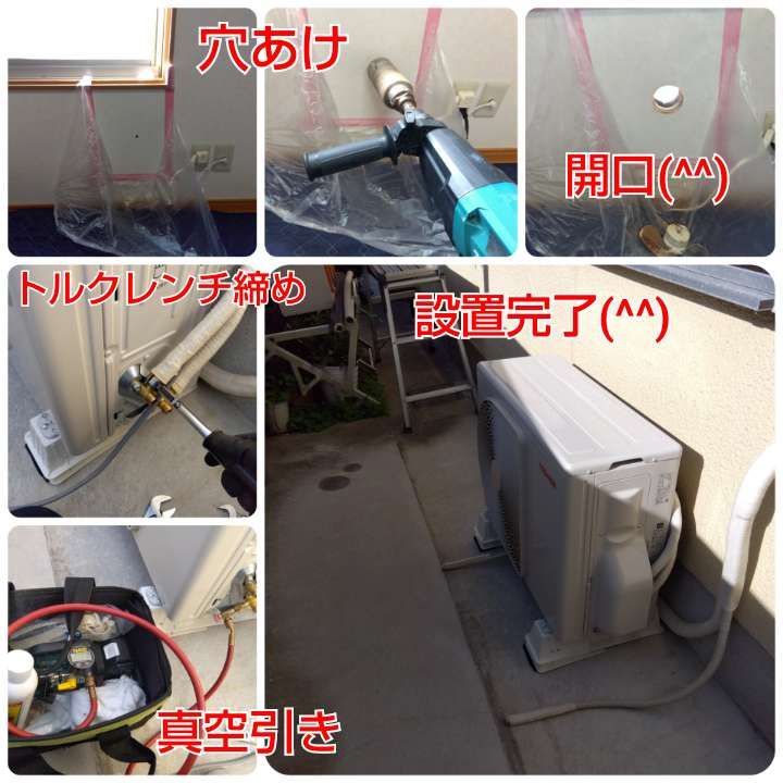 東芝エアコン2.8kw新設でしたが、エアコンの真後ろが日さしやカーポートなどで穴が開けれなかったので、室内配管で下穴開口の施工でした。設置後はカーテンで配管が隠れるので、さほど目立たなかったです。後は電源工事は元々幹線分岐だったので、外部から配線し、床下など、なかなか大変でした。写真ではわかり難いですが、VEの塩ビ管曲げるのに炙ったら少し焦げちゃいました。ごめんなさい。
