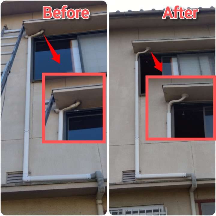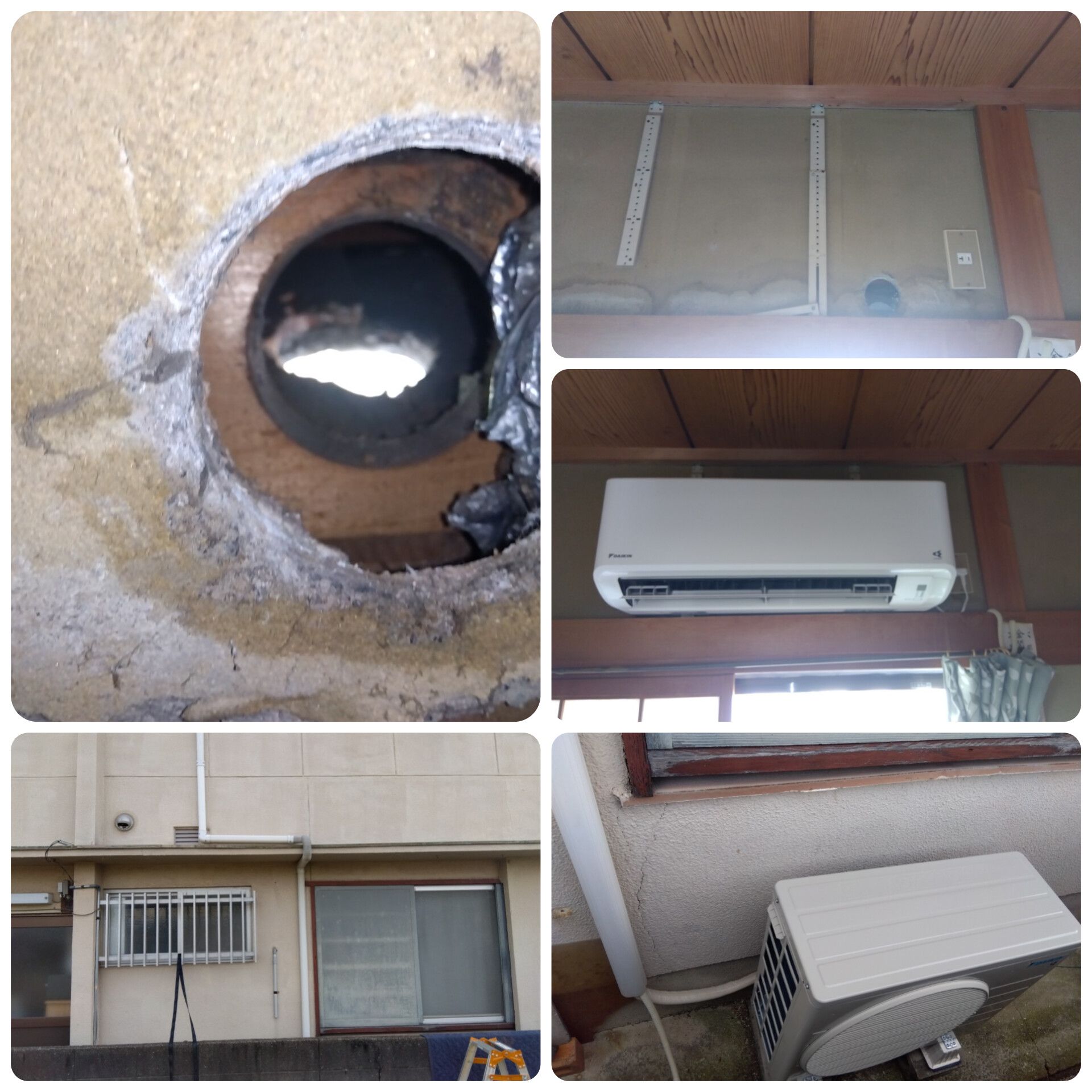 本日は和歌山市で2F→1F立ち降ろしエアコン取替工事。ご覧の通り、外側の穴が軒のひさしの下から配管をだすパターンのやつです。大阪ではほぼ見かけないのですが、和歌山市では意外とよくあるパターン。ベテランの工事屋さんが恐らく昔よくしていた方法。現代のシャッーボックスがあって裏に穴があけれないのを無理くりいってるやつです。これはなかなかのアイデアなのですが、わたくしみたいに1人で工事を行なう者にとっては、厄介極まりないやつです。ダイキンなので補助配管も短く何とか穴から出たのでハシゴ上でつなぎました。前付いてたのはパナソニックなので、補助配管が長いからまだやりやすかったのかな?同業者様ならご理解いただけますかと。なんとか無事に終了いたしました。