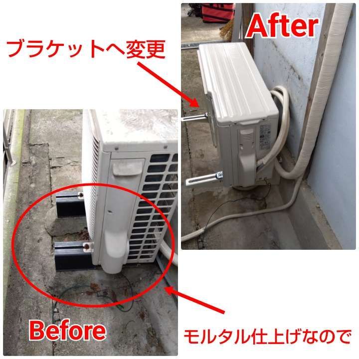既設室外機が、勾配がきつすぎて多分置けなかったので、モルタルで不陸調整分固めていて、今回のが、ピッチも違うので粉砕撤去し、新たにブラケット取り付けとなりました。
