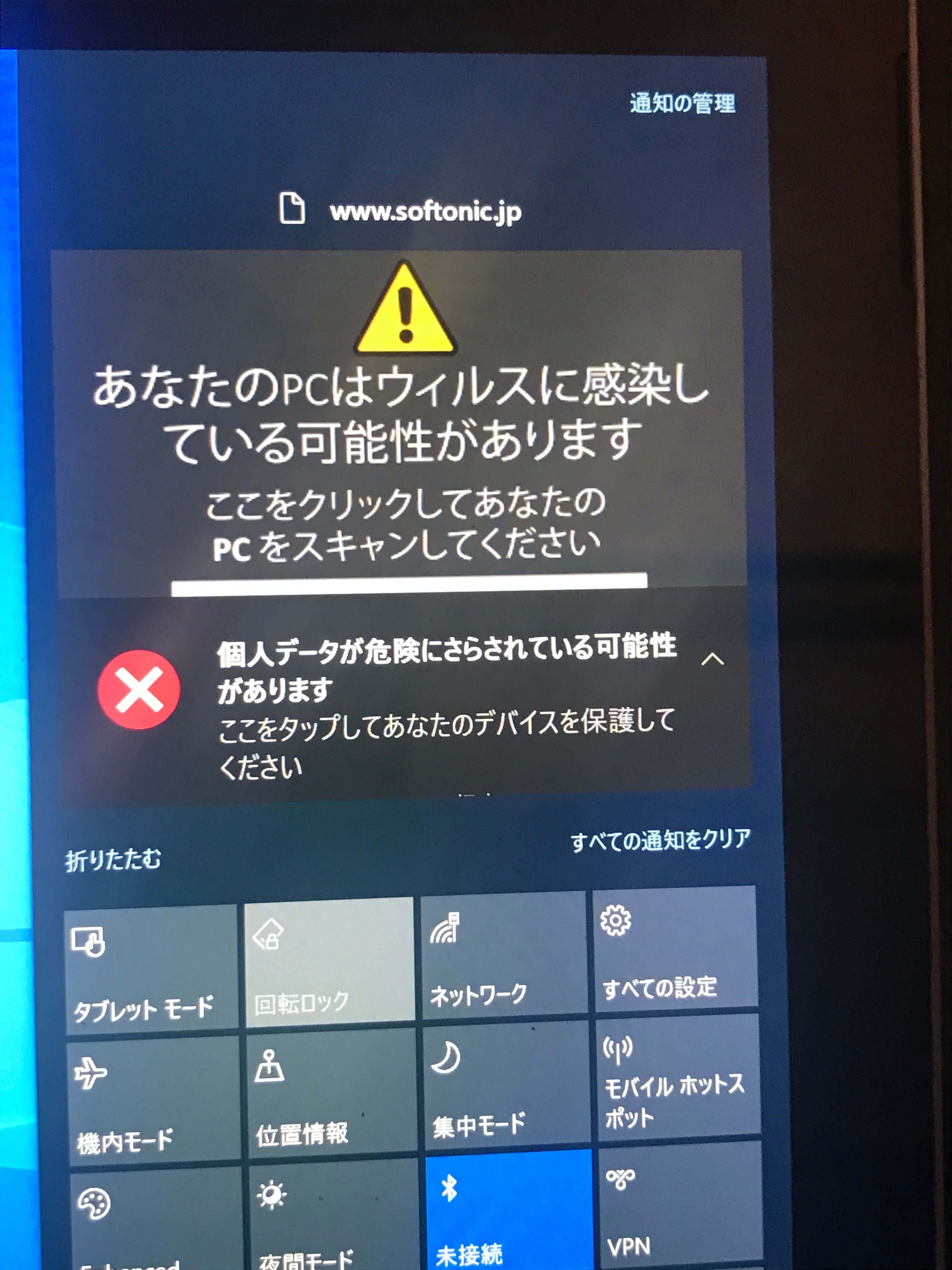 現地で確認したところ、その警告画面は「ウィルスに感染しているように見せかけた詐欺広告サイト」によるものでした。いわゆる“偽ウィルス警告”と呼ばれるもので、ユーザーに不安を与え、不要なセキュリティソフトを購入させたり、個人情報を入力させたりする目的で作られています。