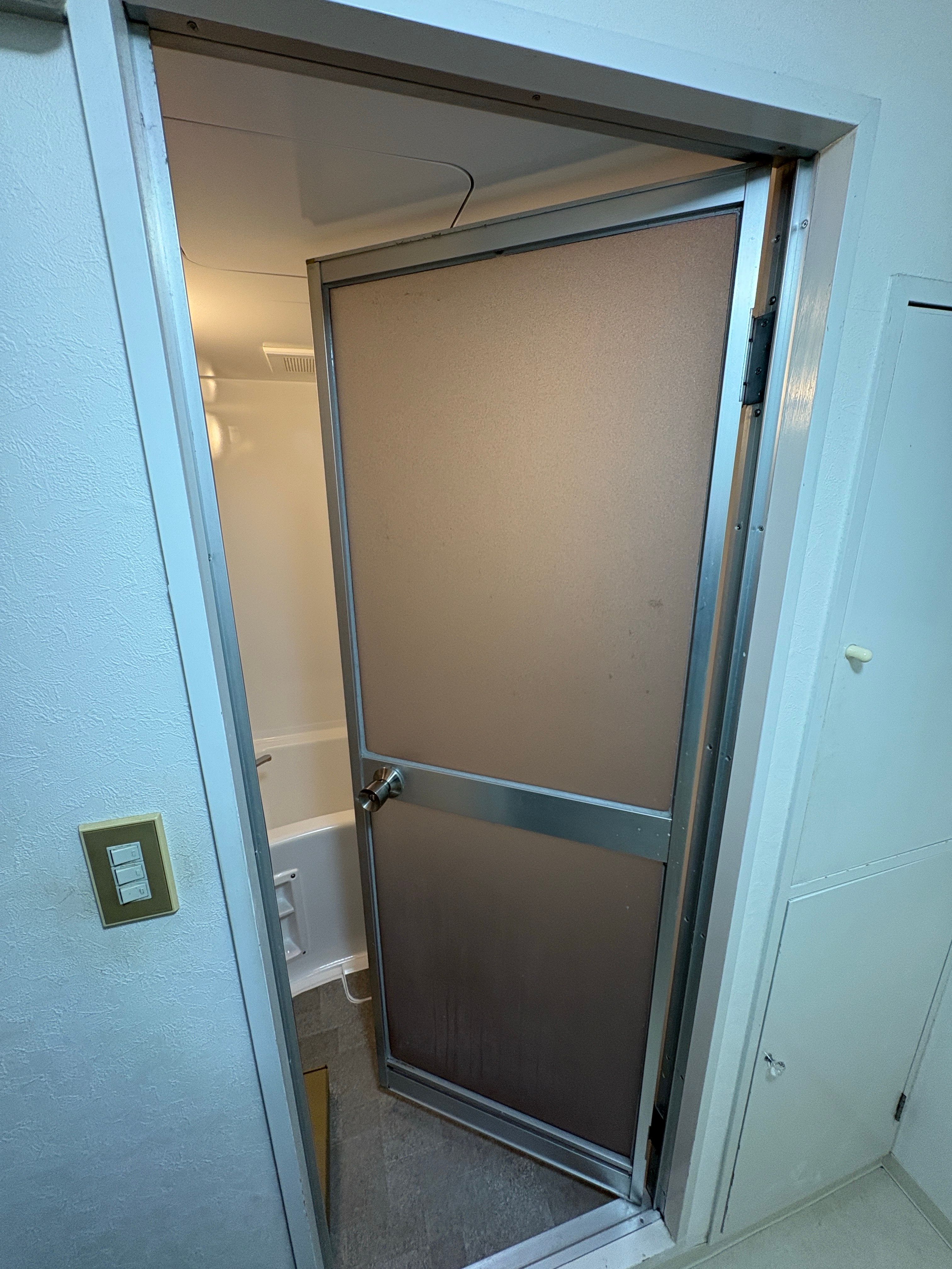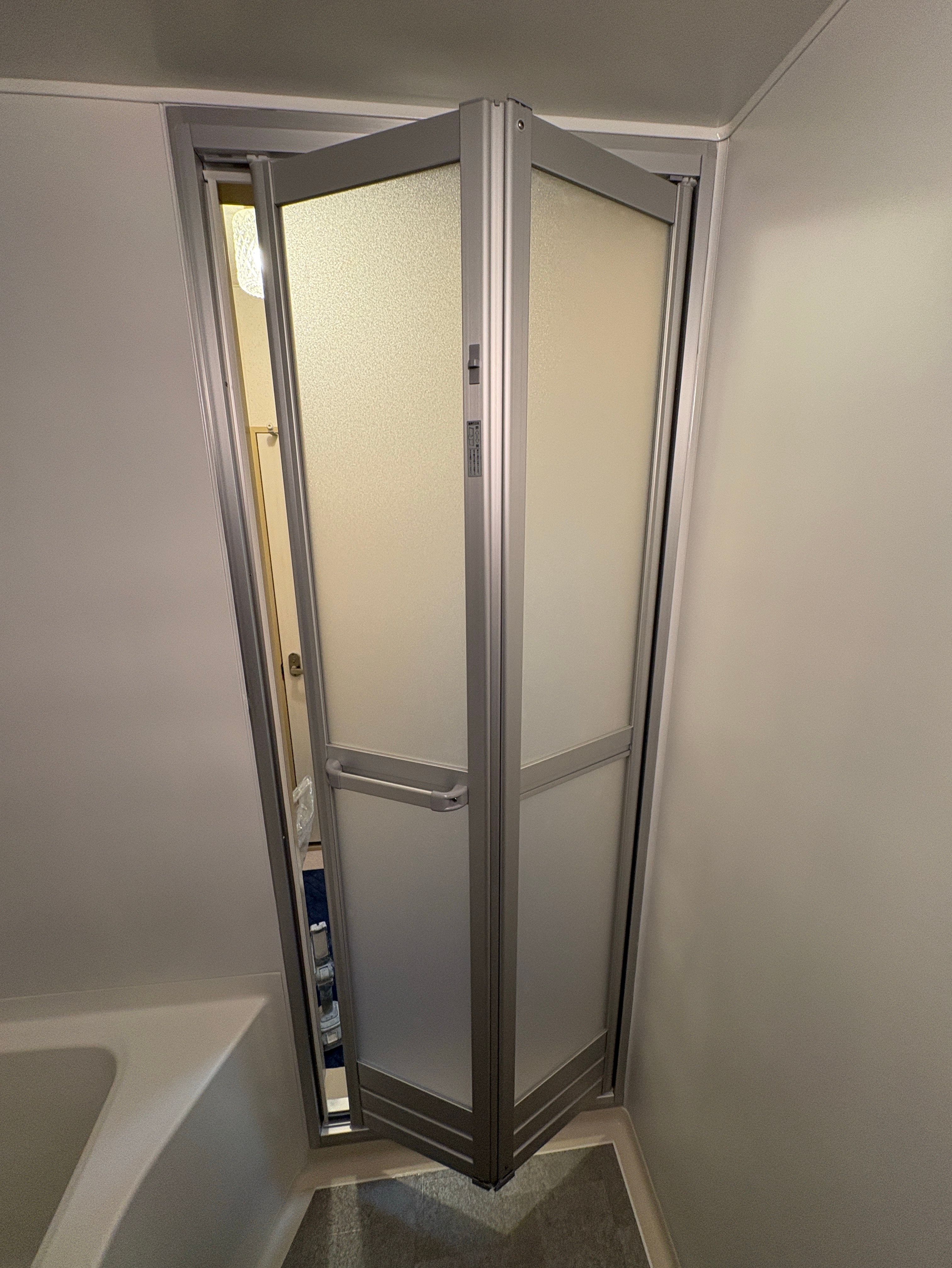 浴室ドアはカバー工法と言う施工をいたします、現行の枠の内側に新しい枠を設置しその新しい枠にドアを取付ます。